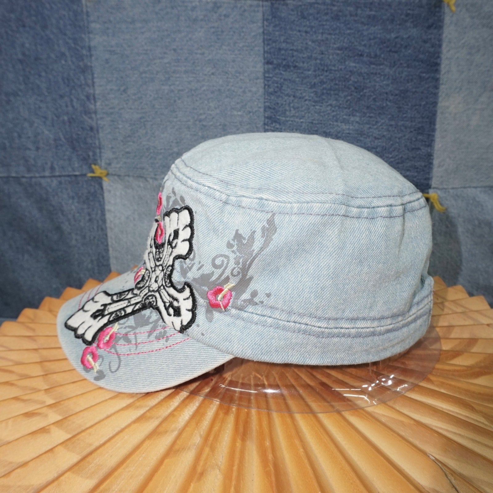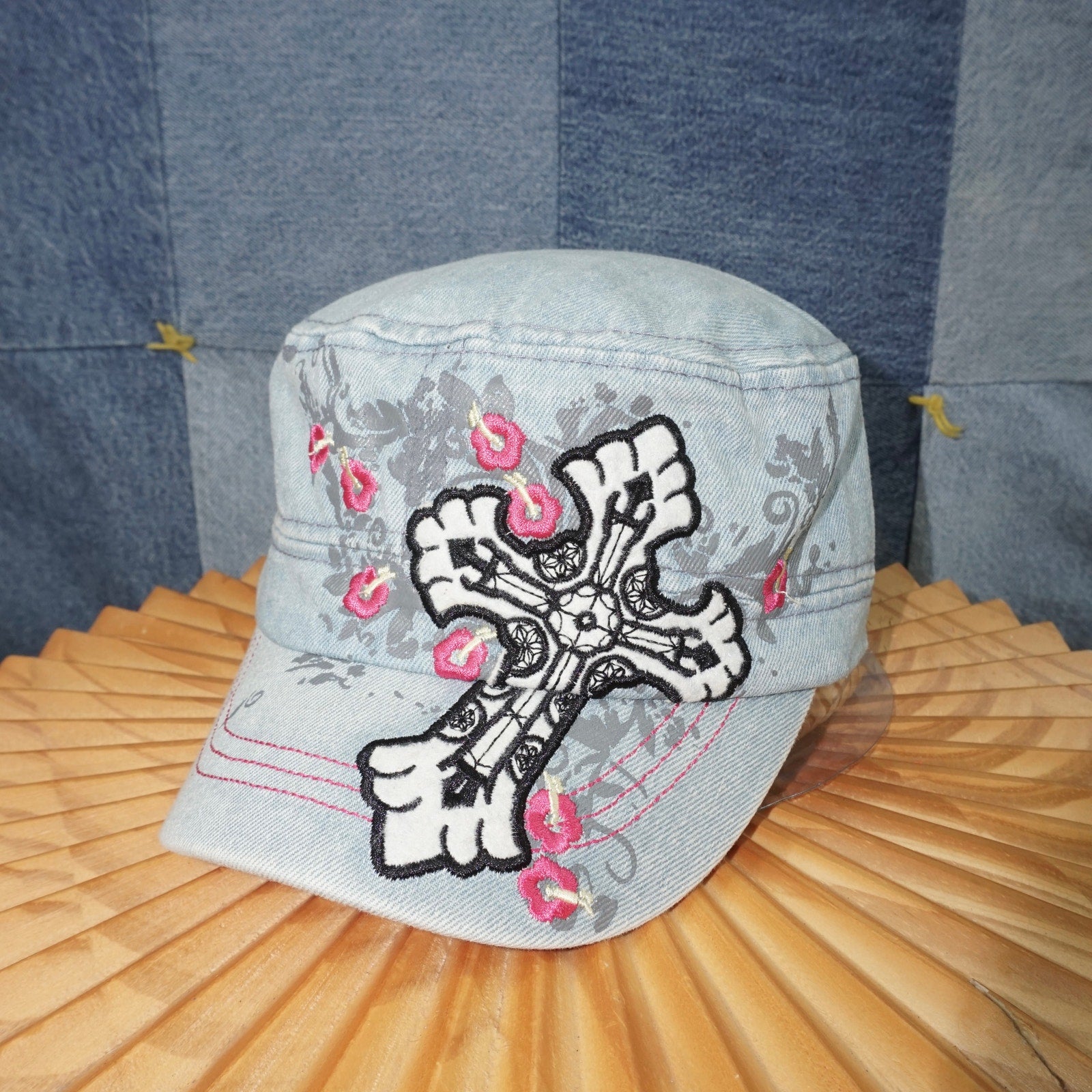 OSFA - Vintage / Y2K women’s/FEMME embroidered flowers and cross logo graphic grunge 2000’s era mall Goth at Hardy style denim colored hat with pink accents cadet/military cap essential