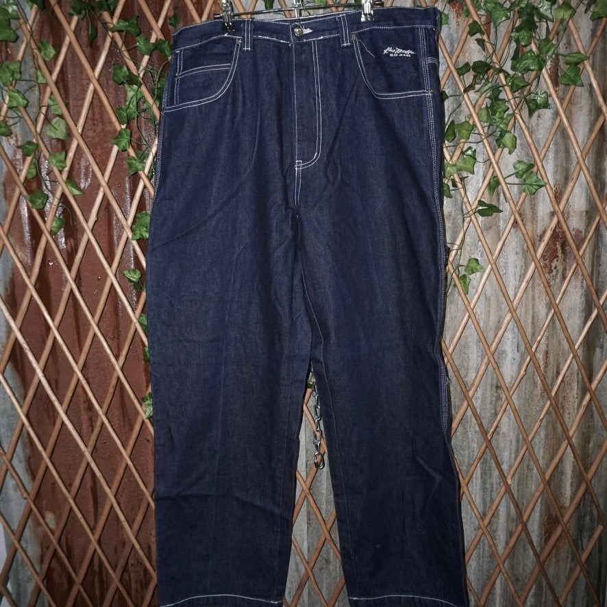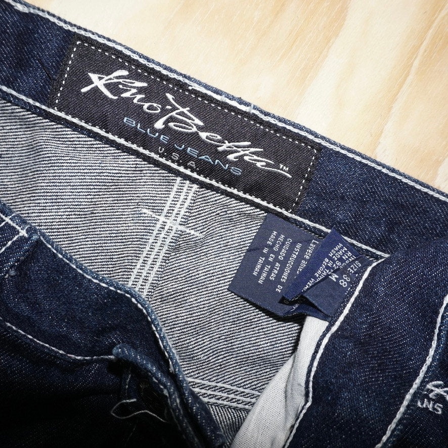 38 - Vintage / Y2K Vintage KNO BETTA brand embroidered style carpenter cargo style spell out dark blue with yellow stitching 1990s/2000 era essential worker style