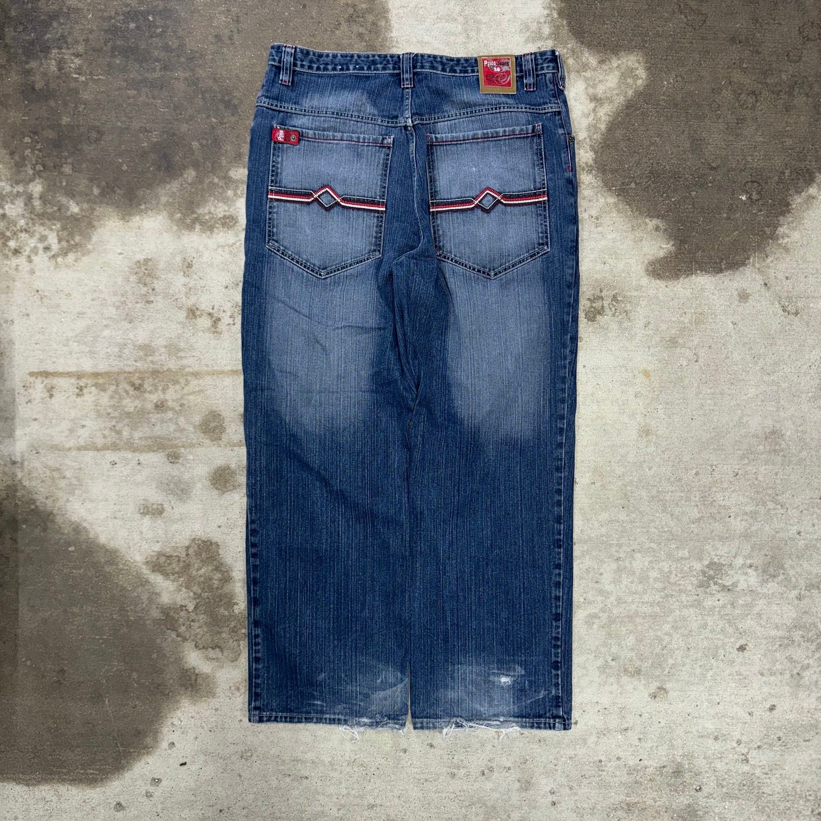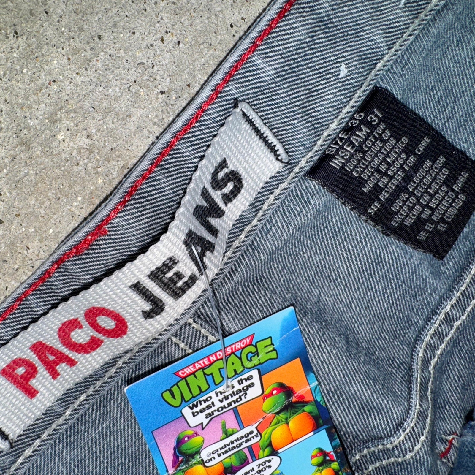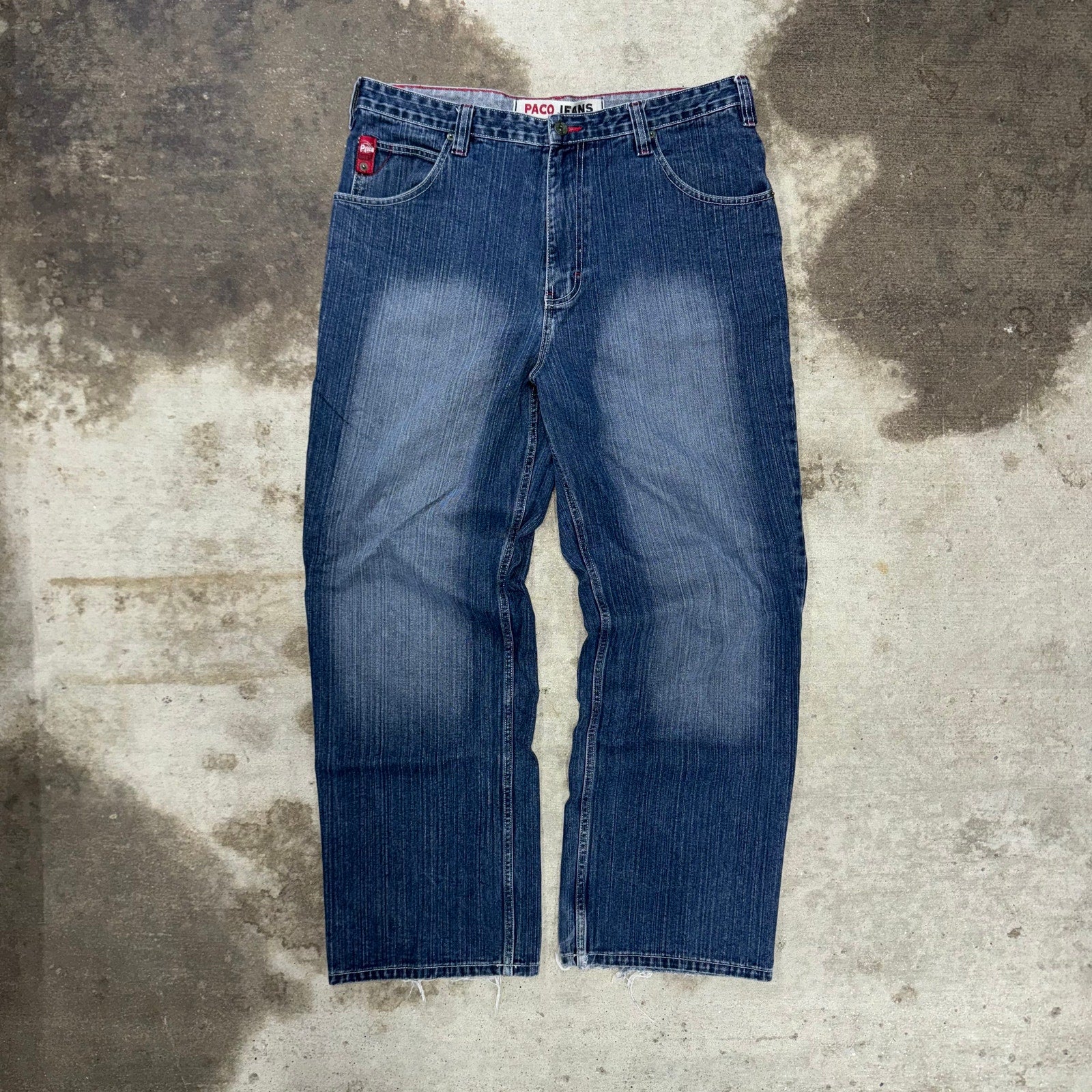 Vintage / Y2K Paco jeans, embroidered pattern back pocket rare 1990s/2000s era deep dark wash with good fade and wear baggy wide leg pants, grunge Mall Goth, Jesse Pinkman style hip-hop style essential