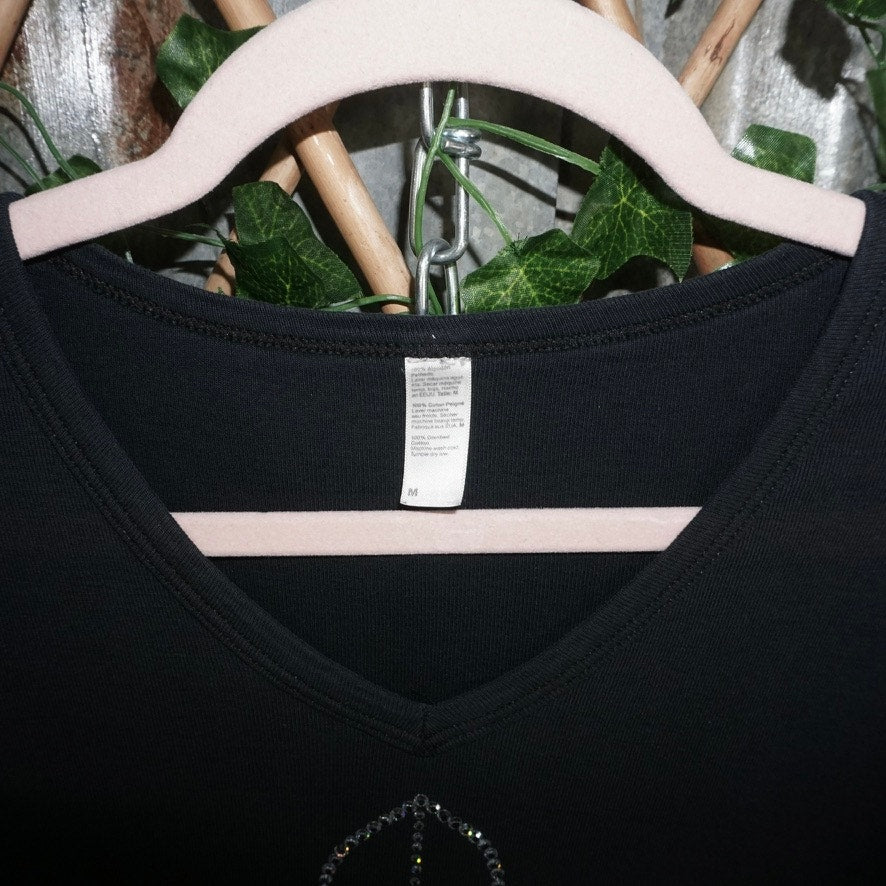 Medium - Vintage / Y2K long sleeve black rhinestone royal saint New Orleans style bling front chest hit sleeve hit 2000s era women’s/FEMME T-shirt