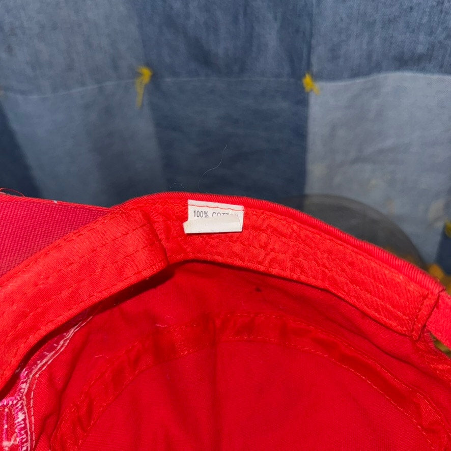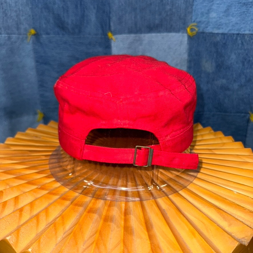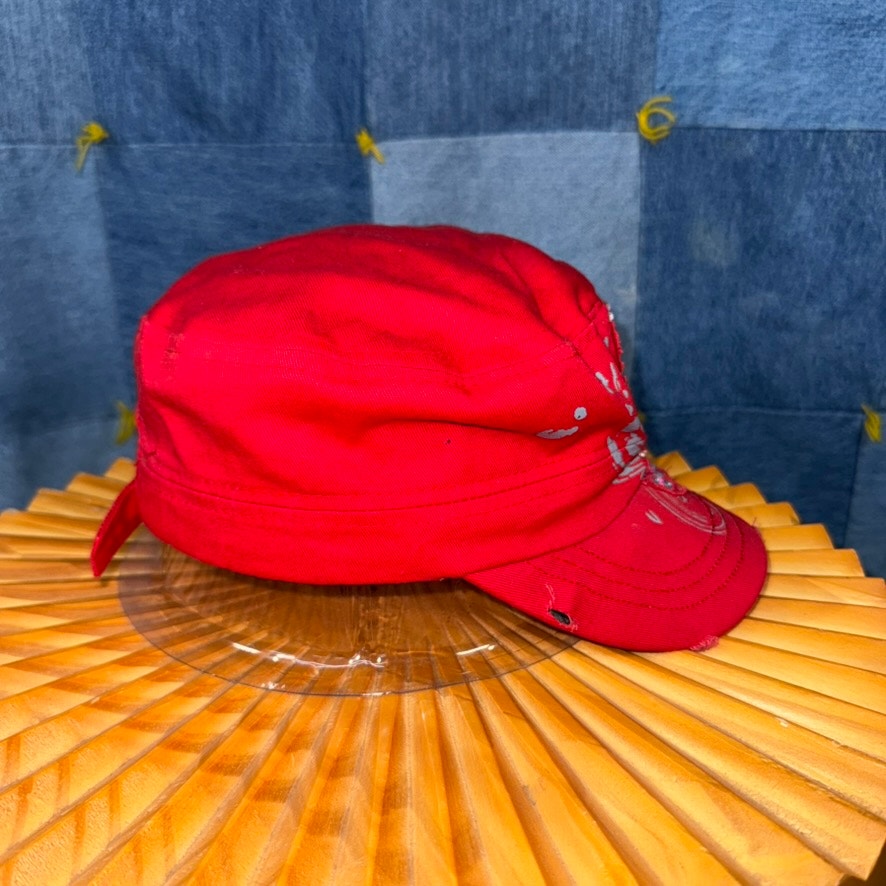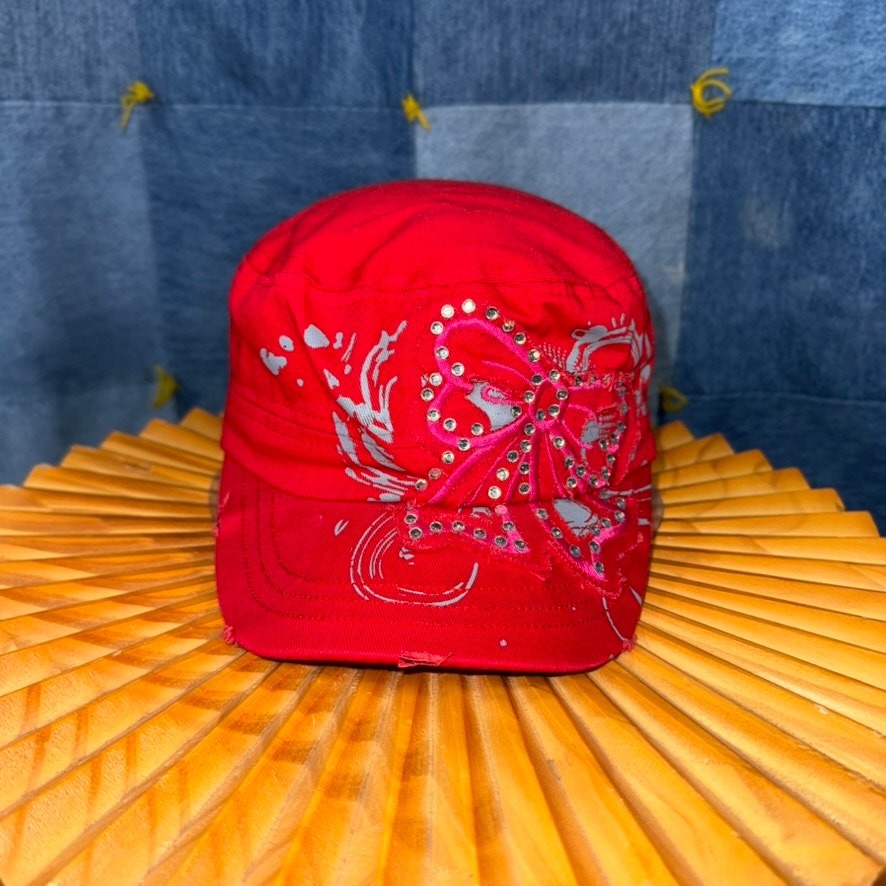 OSFA - Vintage / Y2K embroidered rhinestone bling bow logo, graphic women’s/FEMME grunge 2000 era military/cadet cap/hat, red color way