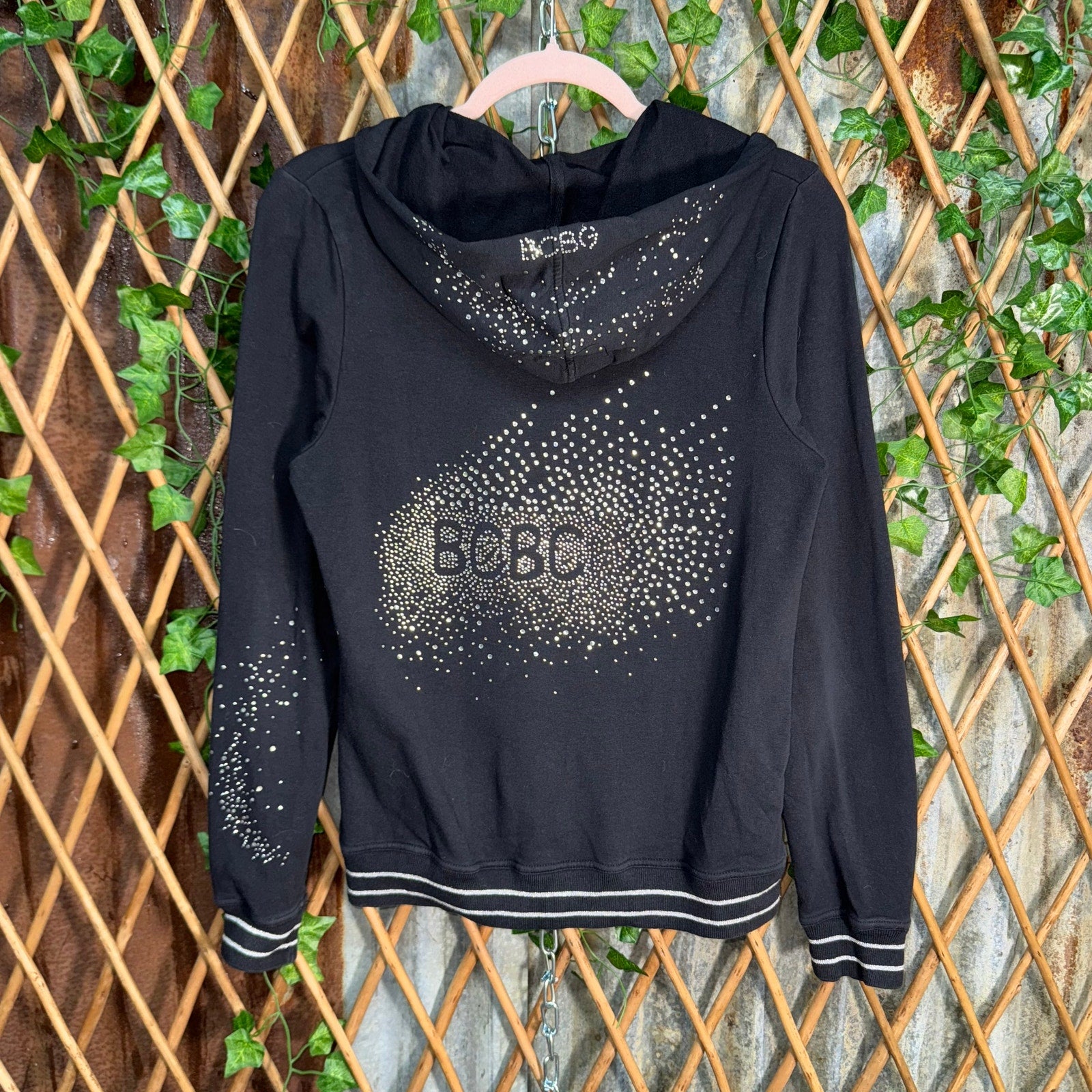 Vintage / Y2K BCBG rhinestone all over front back sleeve hoodie hit black hooded sweatshirt women’s/FEMME spell out logos Grail 2000’s era preppy, grunge mall Goth style