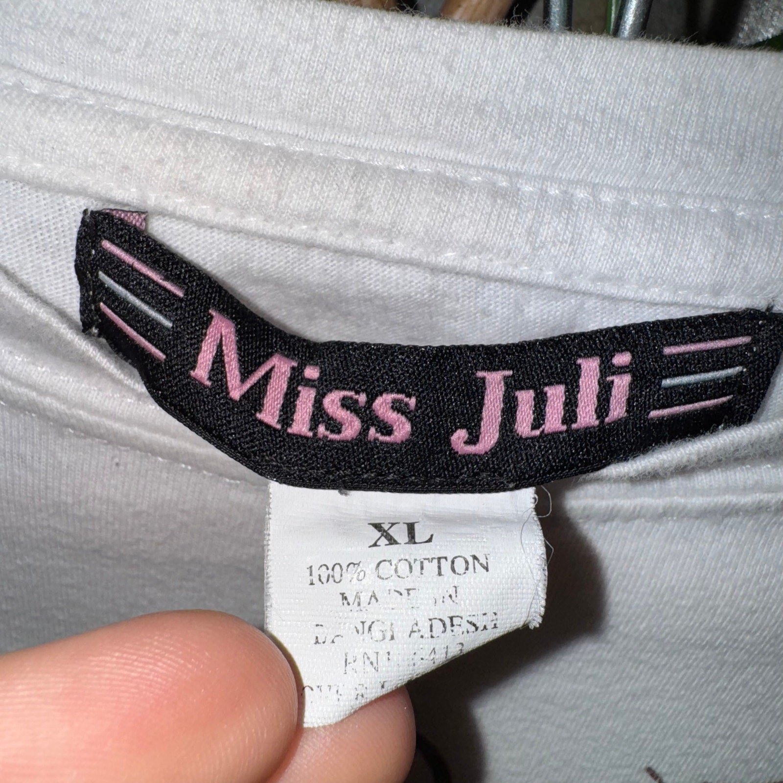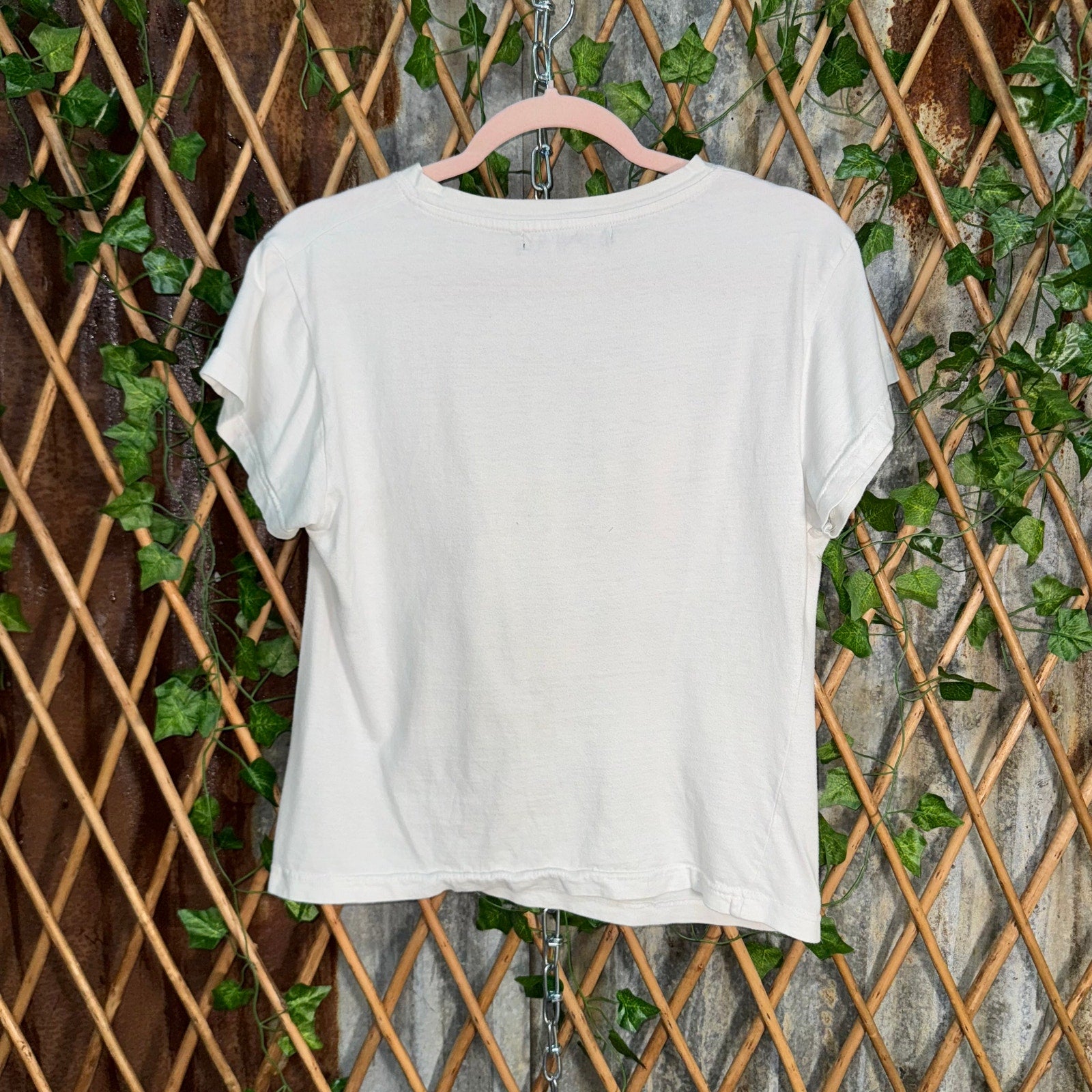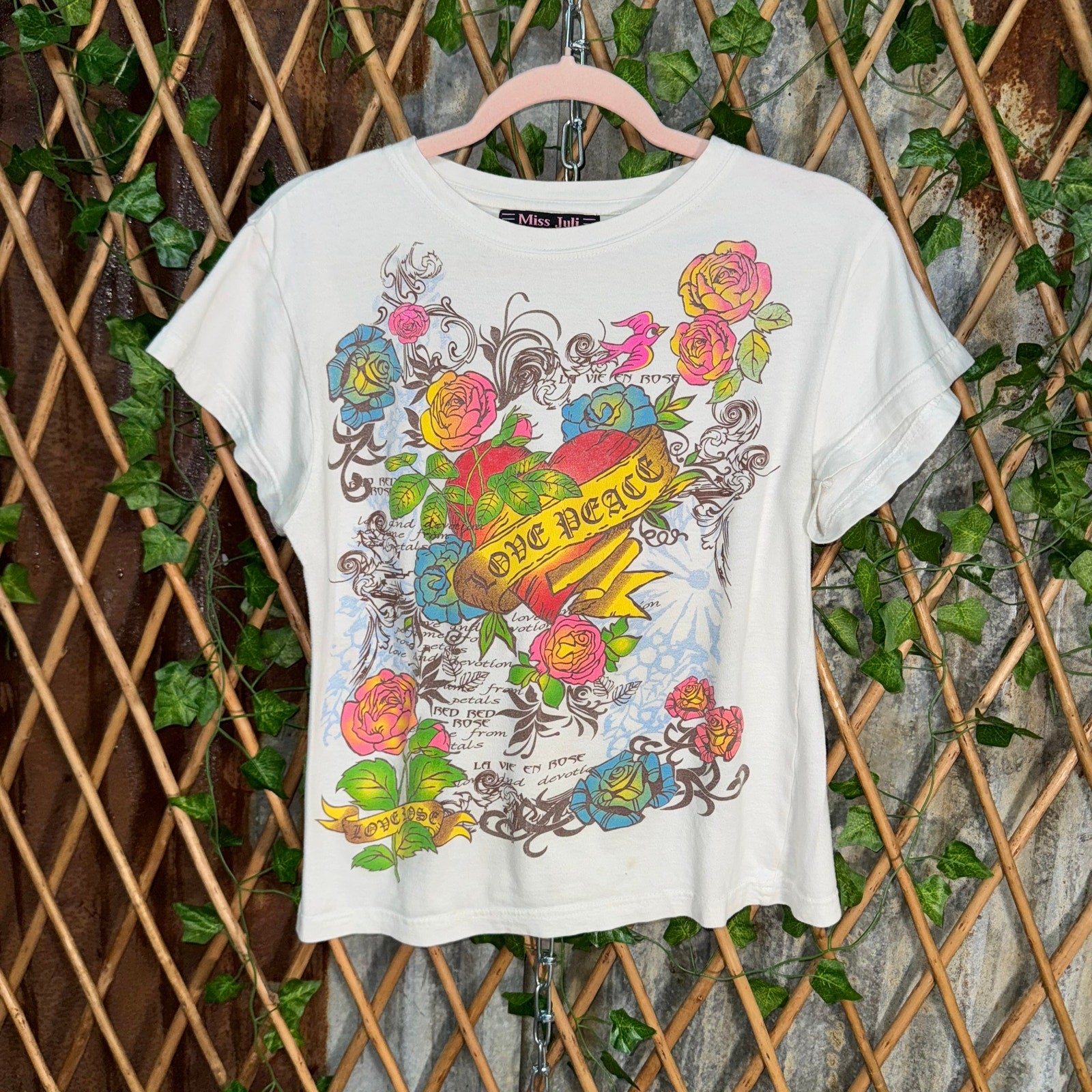 Vintage / Y2K love, peace, heart, flowers, grunge, white T-shirt, 2000’s era tattoo Ed Hardy Christian audigier style women’s/FEMME on Miss JULI Tag essential grunge, preppy Mal Goth style