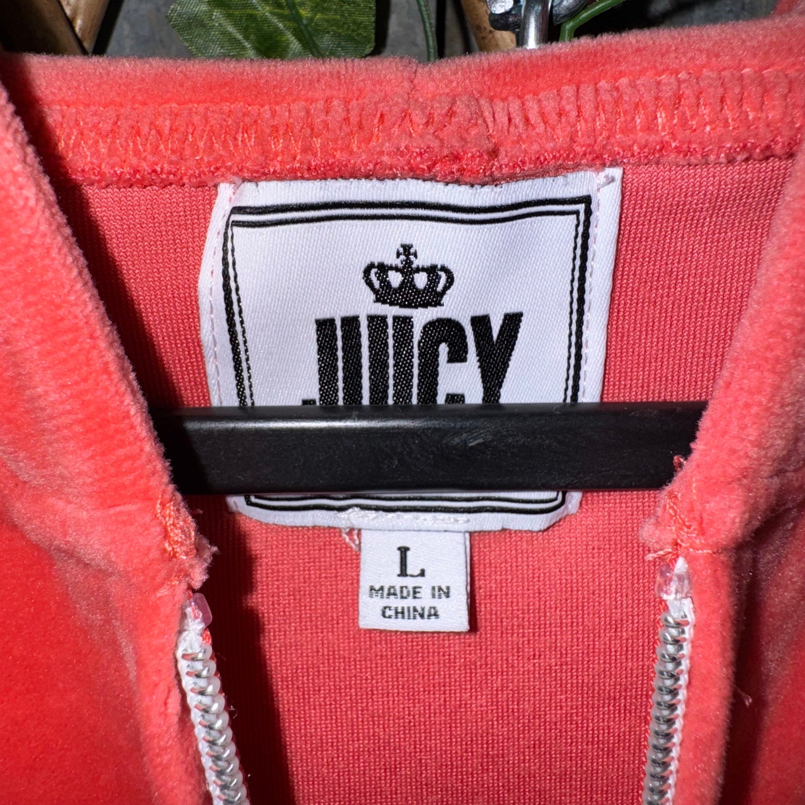Vintage / Y2K juicy couture, short sleeve hoodie, hooded sweatshirt, velour, peach orangeish pink color, way front and back kit, double-sided multiple graphic rhinestone spell out 2000’s era preppy style femme/women’s
