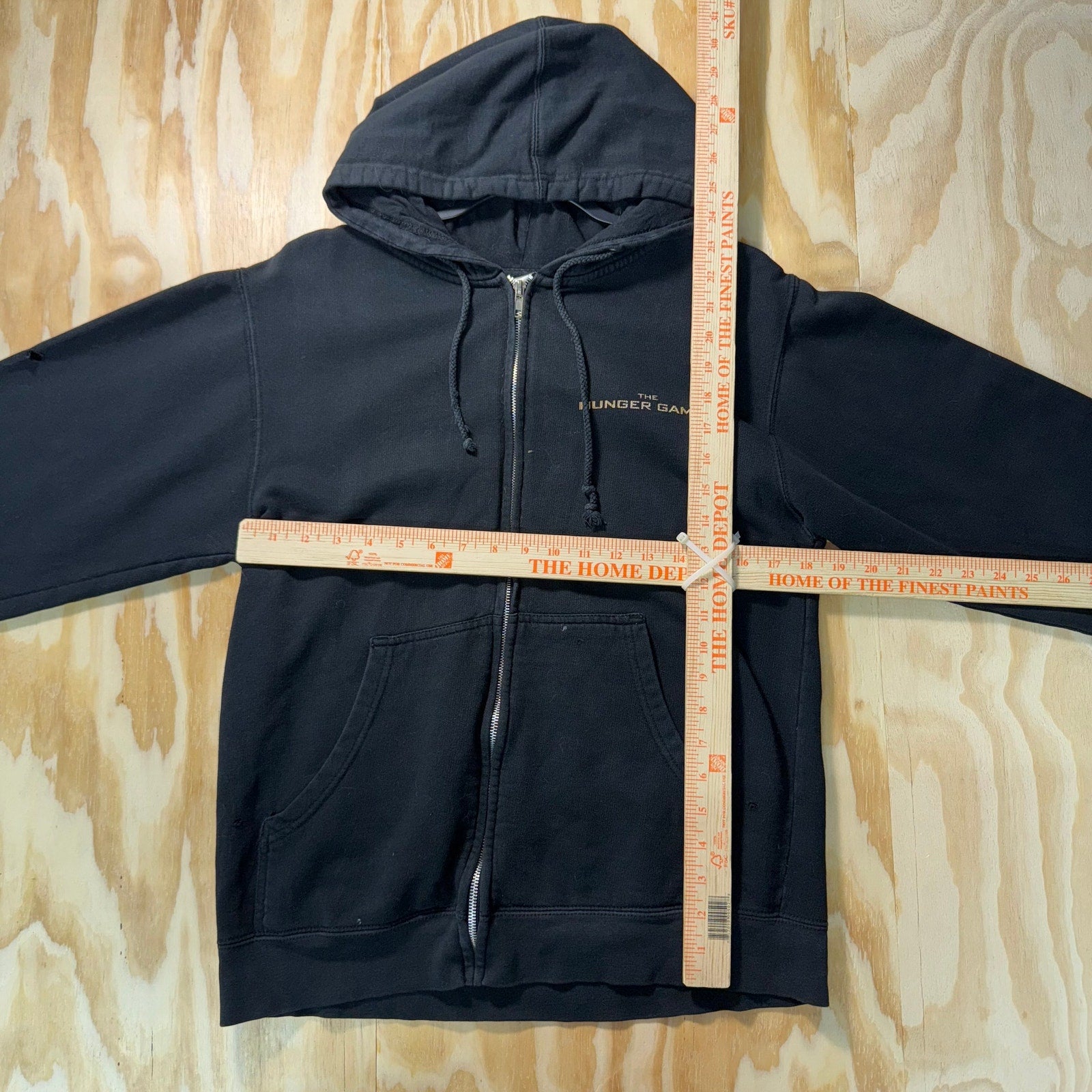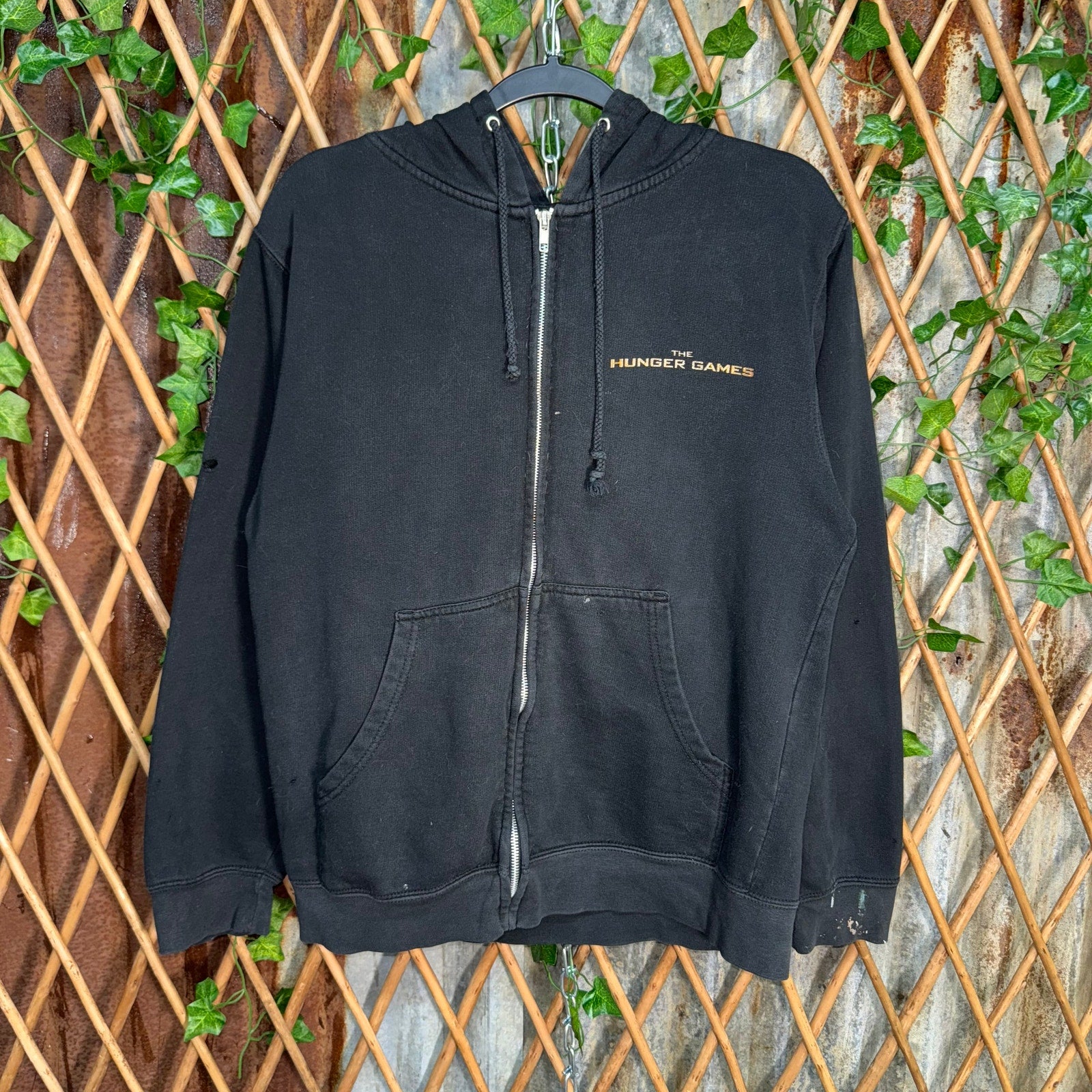 Vintage / Y2K the hunger, games movie promo front and back hit double-sided multiple graphic paint splatter distressed, faded, sick piece essential Katniss Everdeen, peeta mellark faded black zip up hoodie women’s/femme