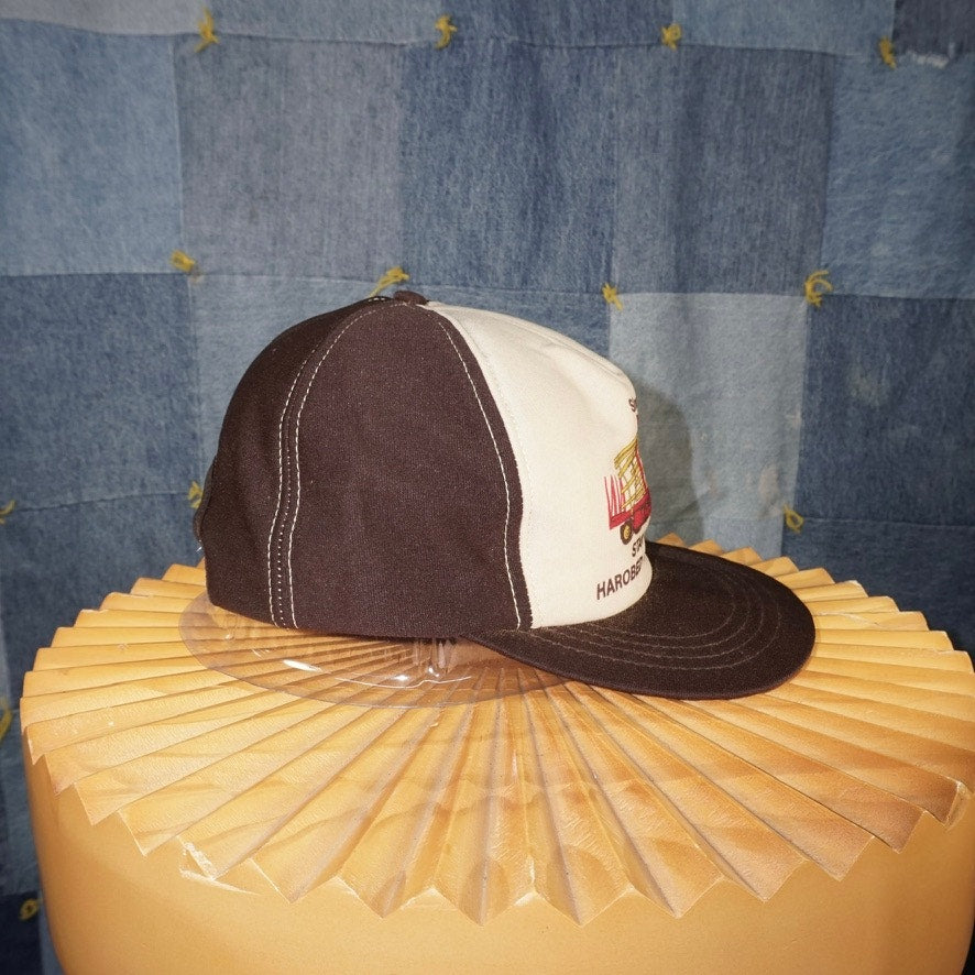 OSFA - Vintage / Y2K Stan Felipe,harobed hay hauling super cool brown/off-white color, two tone hat, screen printed equipment, vehicle, graphic hat, essential white stitching