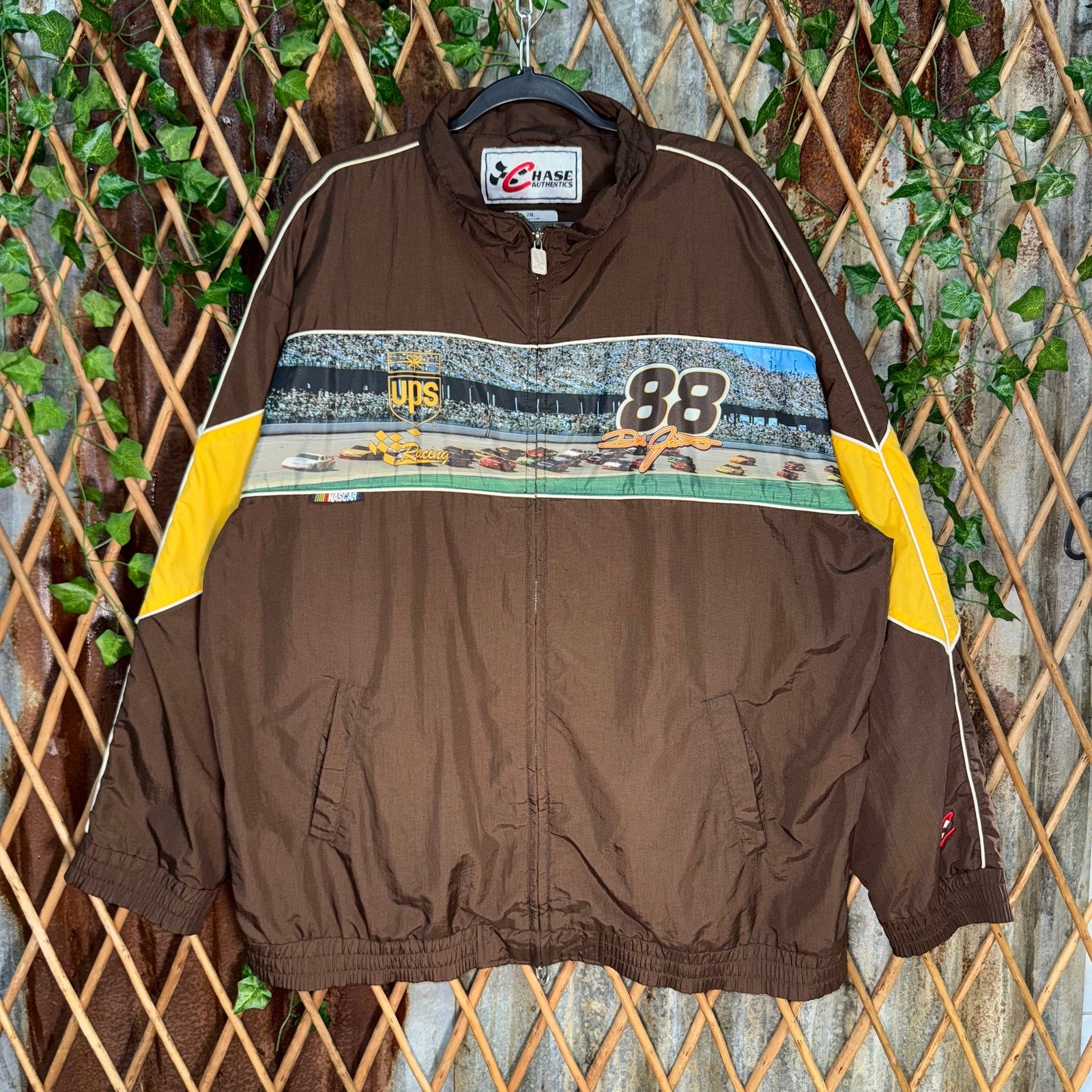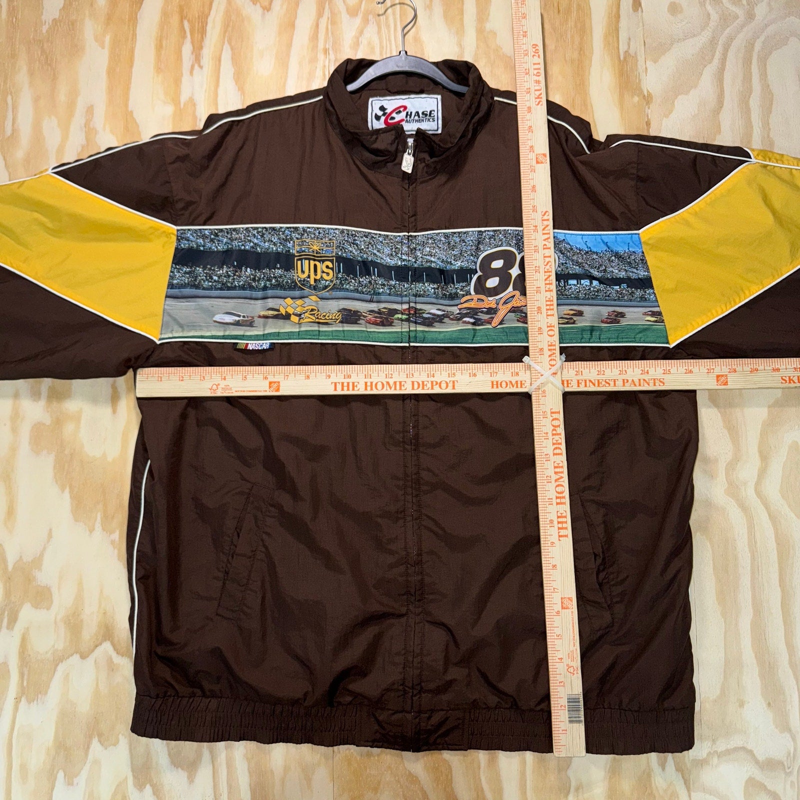 Vintage / Y2K Chase, authentic windbreaker jacket, Dale Jarrett # 88 brown/yellow color way sponsored by UPS crazy wrap around NASCAR graphic with piping going down sleeve and embroidered logo on sleeve