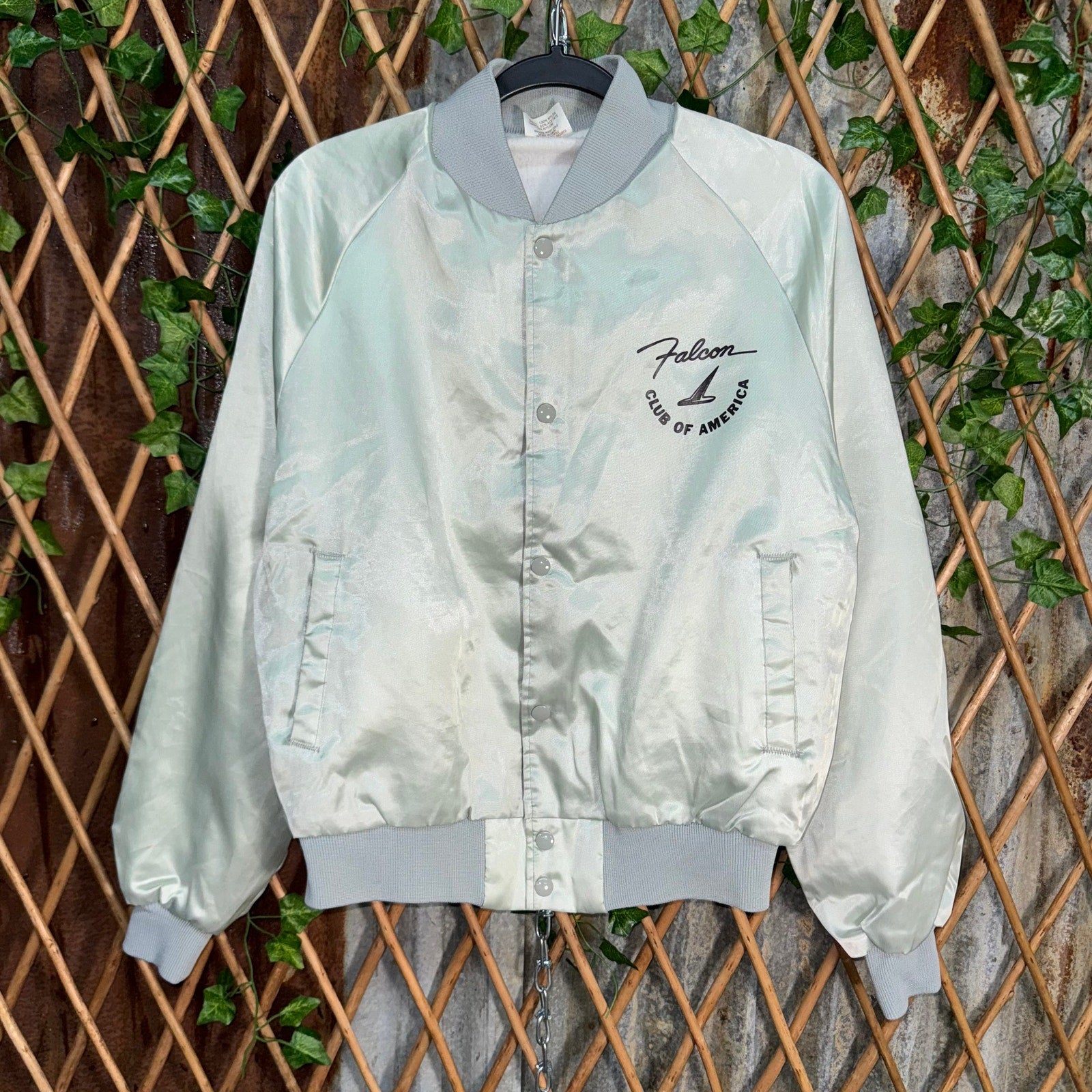 Vintage / Y2K falcon club of America essential satin button up bomber jacket 1980/1990s era essential run back to double sided graphic on Auburn sportswear, Tag made in USA FALCON and FALCON RANCHERO