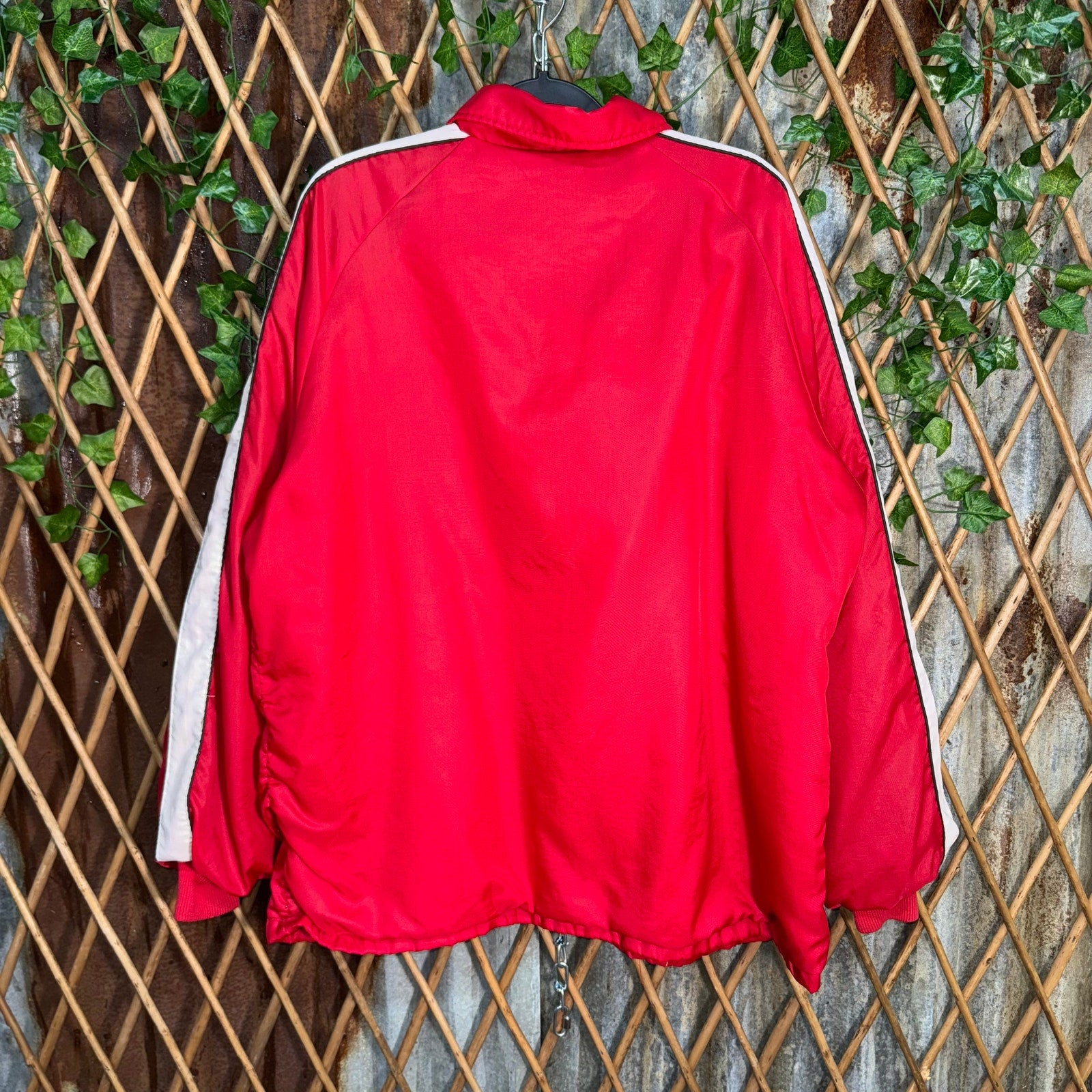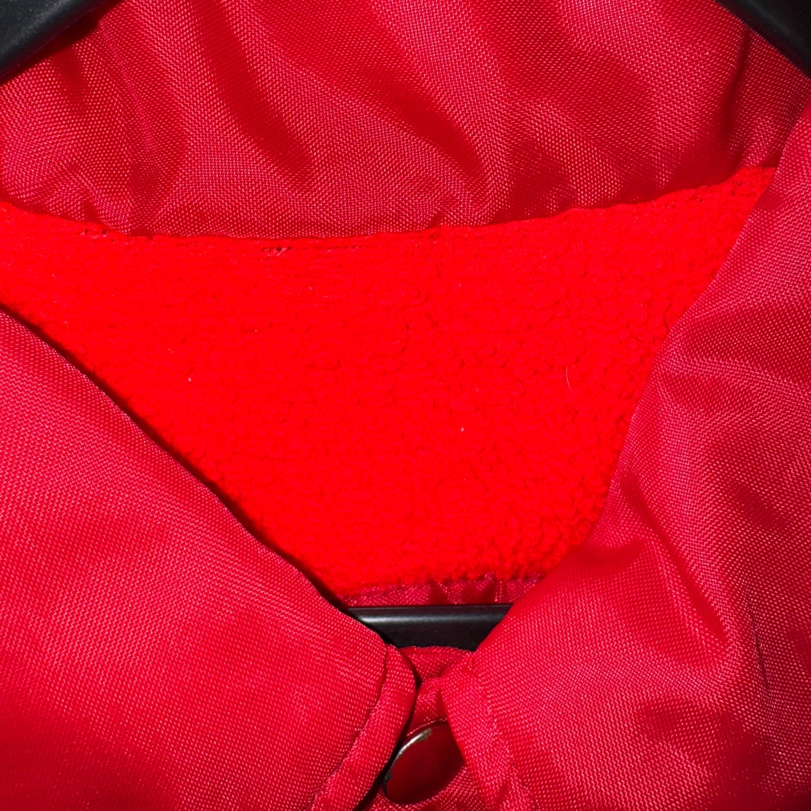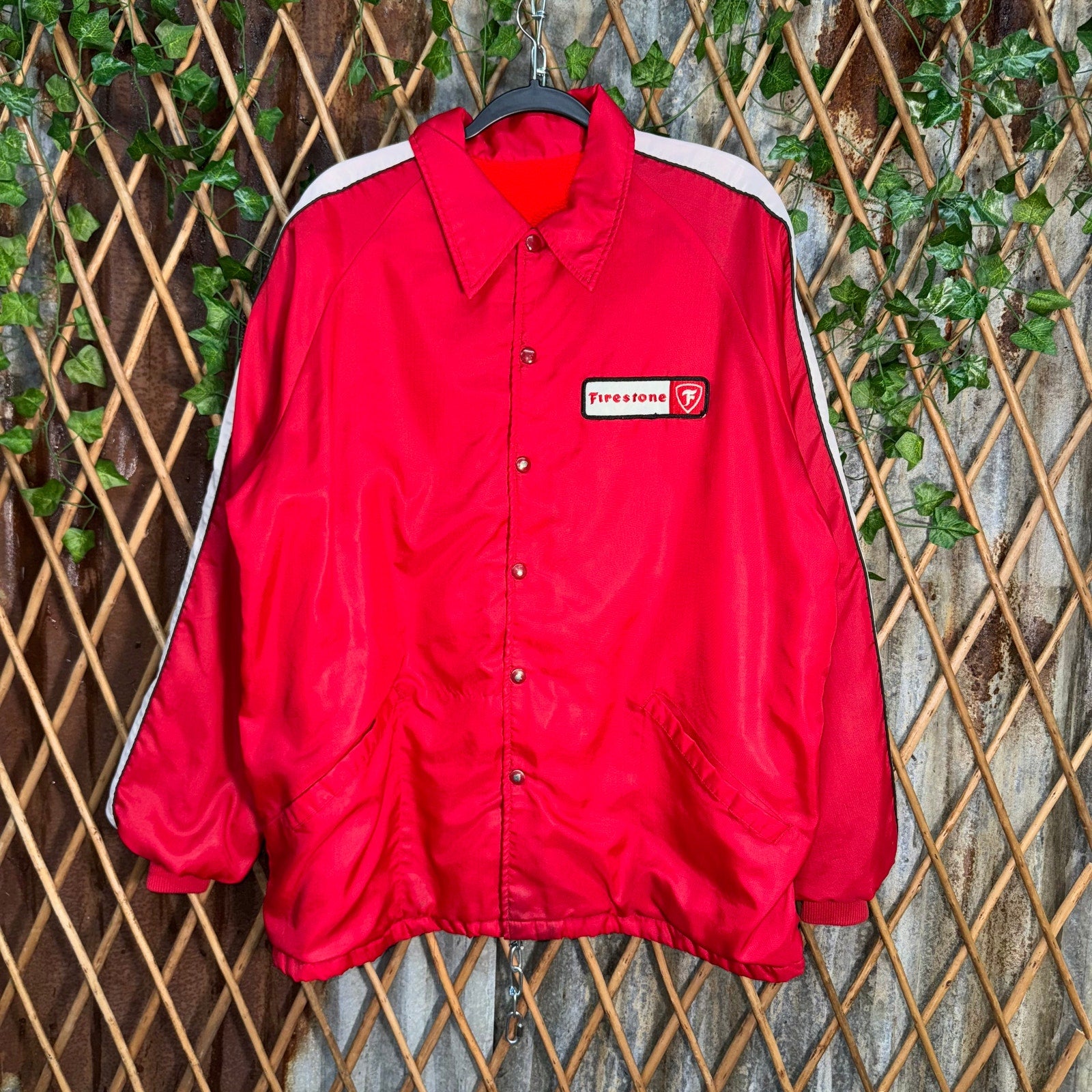 Vintage / Y2K Firestone nylon button up collared polo style jacket Sherpa lined red color way with white stripe on sleeve with black piping essential embroidered patch on chest 1980/1990s era mechanic auto shop essential