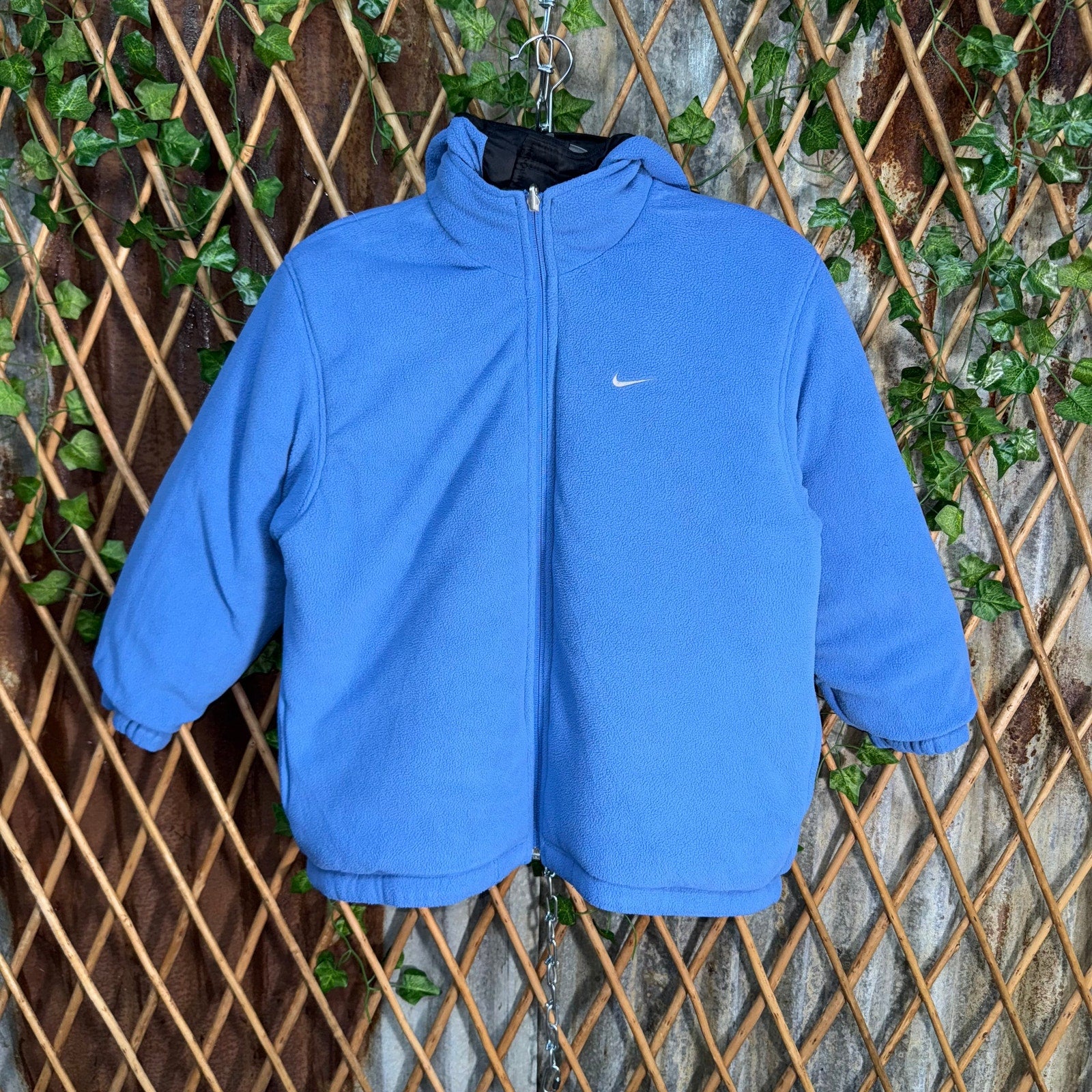 Vintage / Y2K Nike reversible zip up puffer jacket, youth size kids embroidered chest and sleeve hit utility tech wear style outside and inside fleece with embossed spell out back hit 2000s era essential kid core