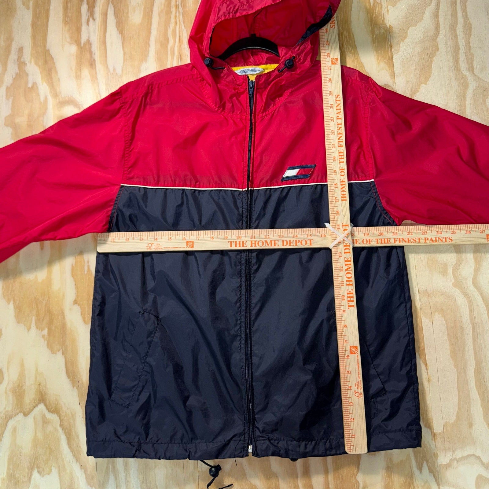 Vintage / Y2K Tommy Hilfiger athletics 2000 era zip up two tone color block, lightweight windbreaker jacket front hit embroidered Patch hoodie hit, double-sided, multiple graphic red/navy blue color way