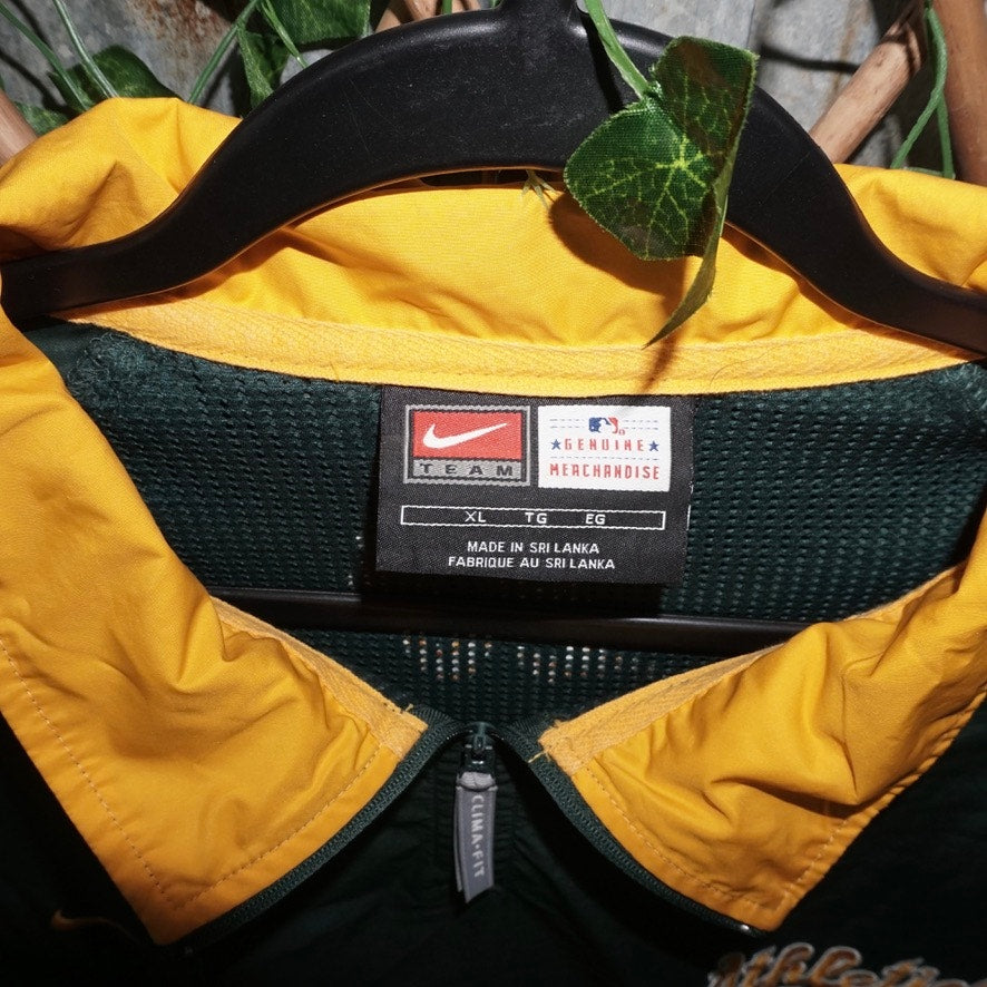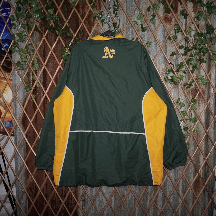 XL - Vintage / Y2K Nike team x genuine merchandise MLB Collab embroidered quarter zip, lightweight windbreaker, embroidered chest hit and back hit double-sided multiple graphic Oakland athletics A’: green/yellow color way MLB baseball sportswear essential