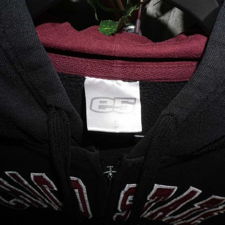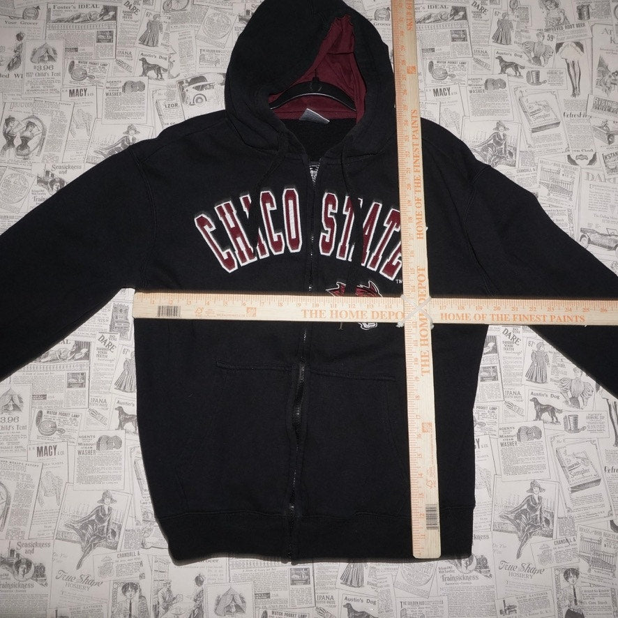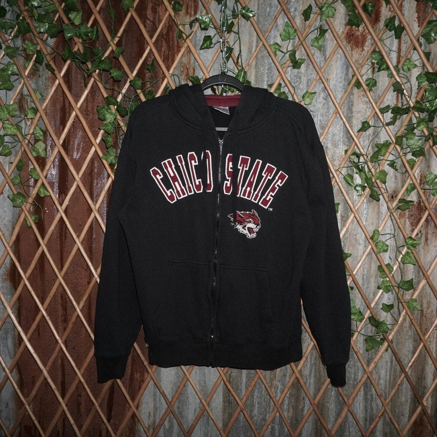 Small - Vintage / Y2K Chico State University arc logo embroidered patch zip up hoodie, hooded sweatshirt collegiate college black color way on E5 Tag maroon color lined hood