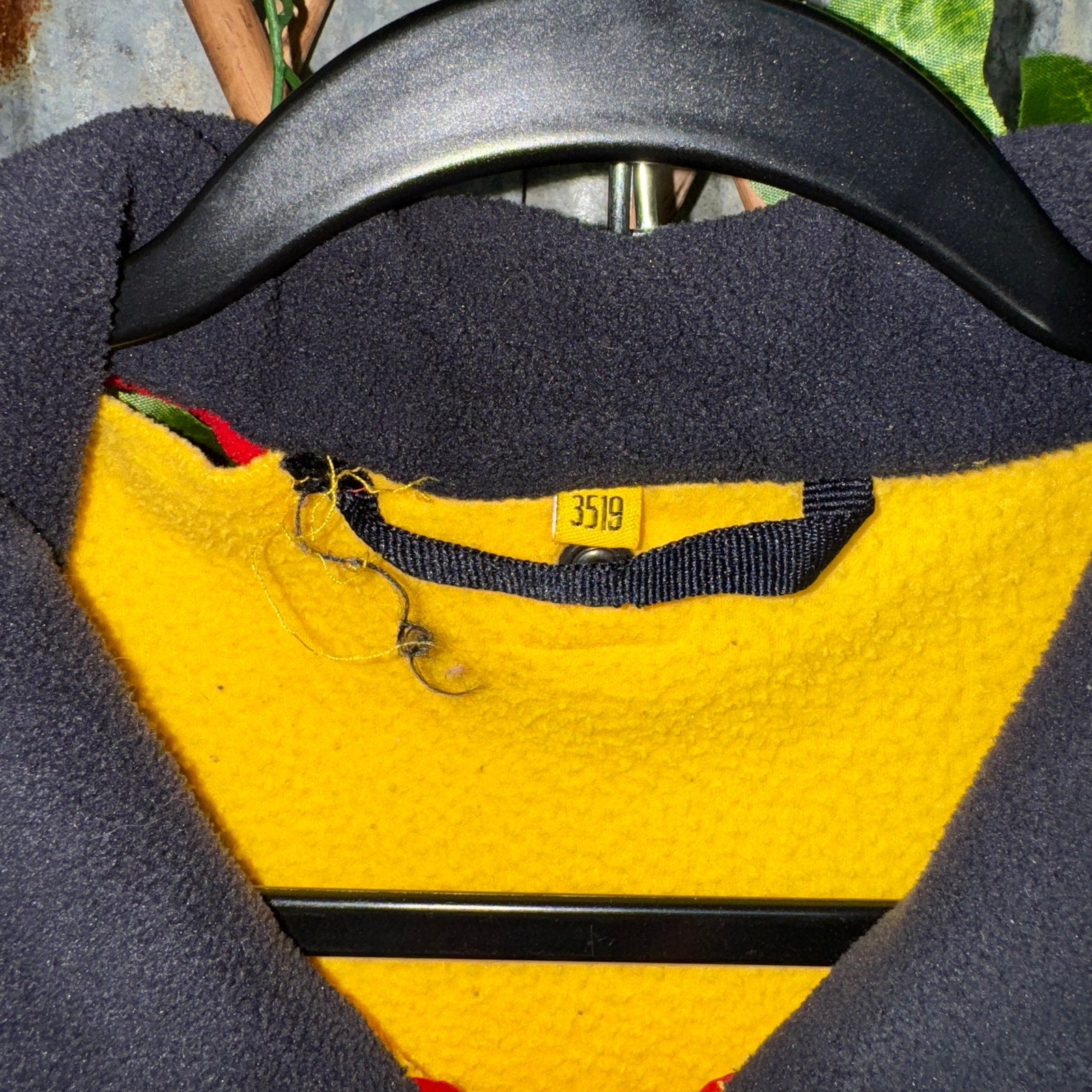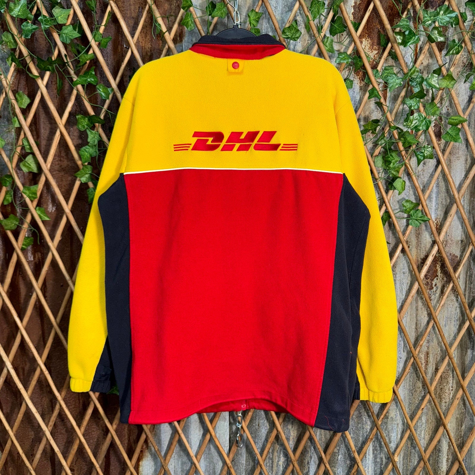 Vintage / Y2K DHL embroidered chest hit logo spell out zip up color block red/yellow with navy blue accents quarter zip 1/4 zip 2000s era sweatshirt, delivery service front and back hit double-sided multiple graphic condition shown in pictures