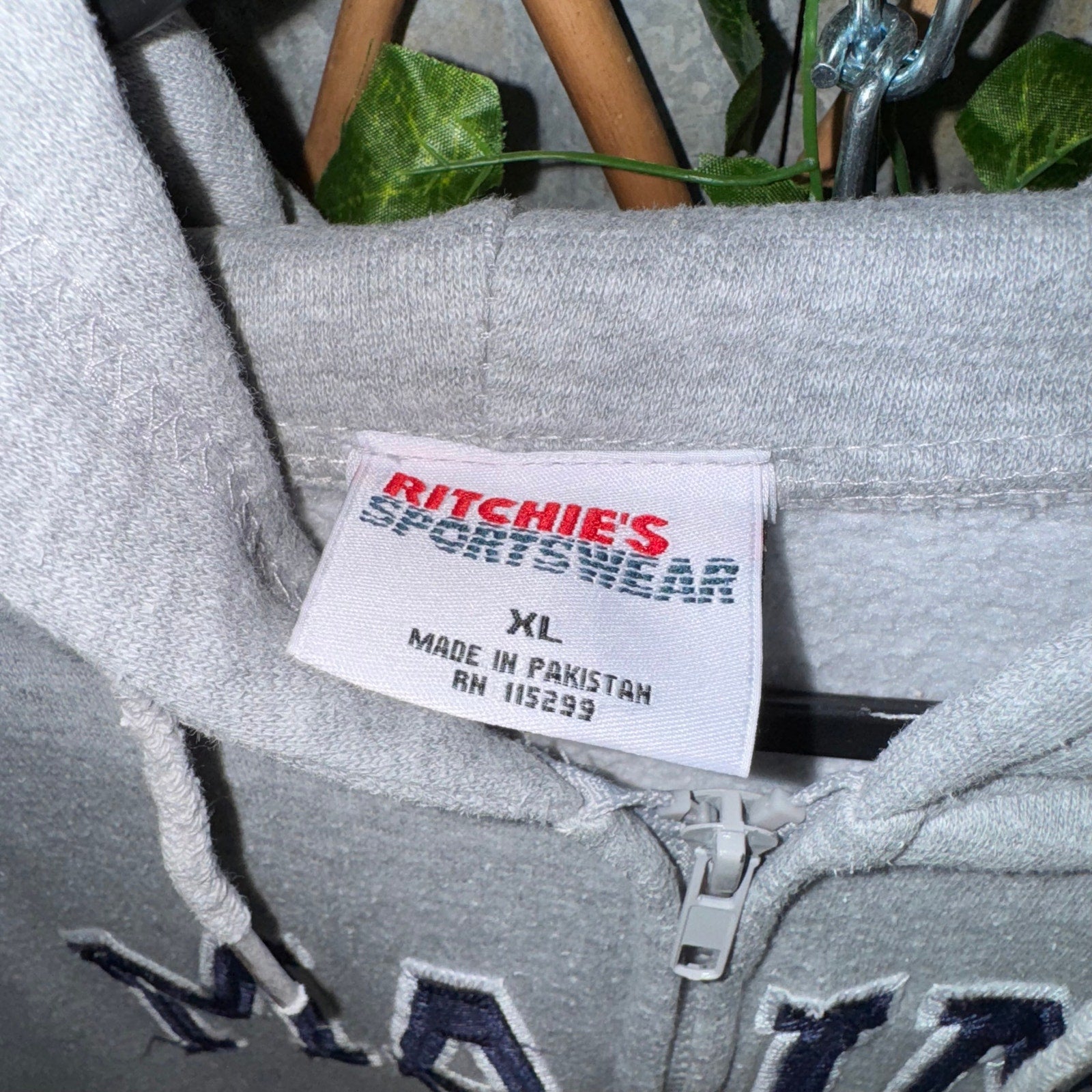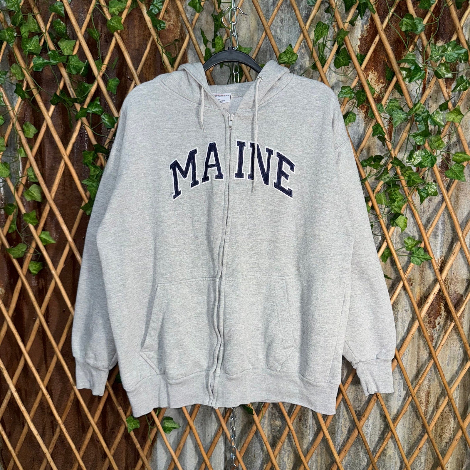 Vintage / Y2K zip up embroidered chest hit arc spell out collegiate style tourist/destination Maine East Coast essential white gray color way on Richie’s sportswear