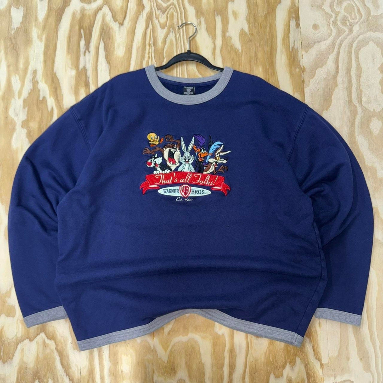 Vintage / Y2K Looney tunes embroidered crewneck tweety bird, Sylvester, Tasmanian devil, Buggs bunny, road runner, Daffy Duck, wil e coyote graphic “that’s all folks” Warner bros est 1923 boxy fit