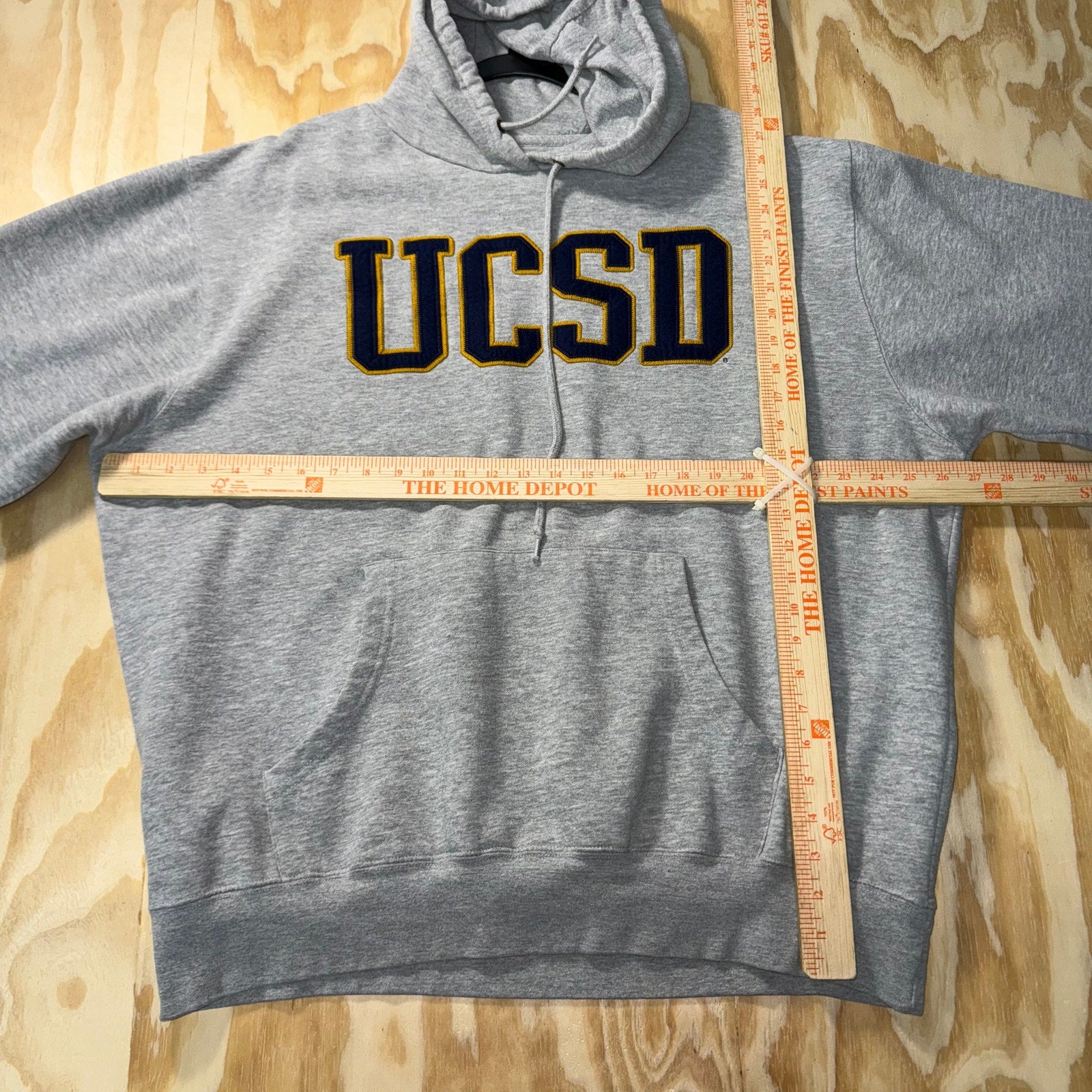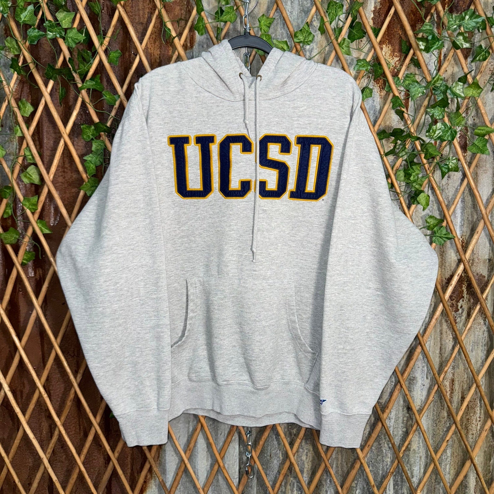 Vintage / Y2K UCSD university California San Diego 2000s era on blue 84 Tag, Heather Gray, long sleeve hooded sweatshirt hoodie essential embroidered Patch logo collegiate college