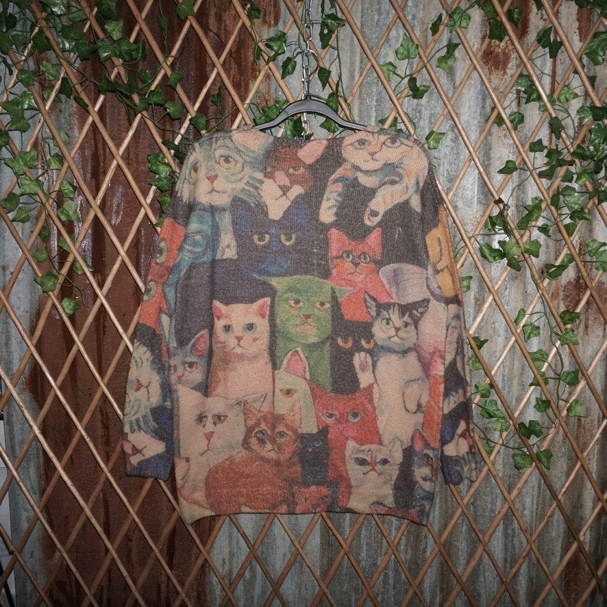 XL - Vintage / Y2K cats AOP long sleeve knitted sweater front and back double-sided multiple graphic cute kittens, abstract art essential 1990s/2000s era