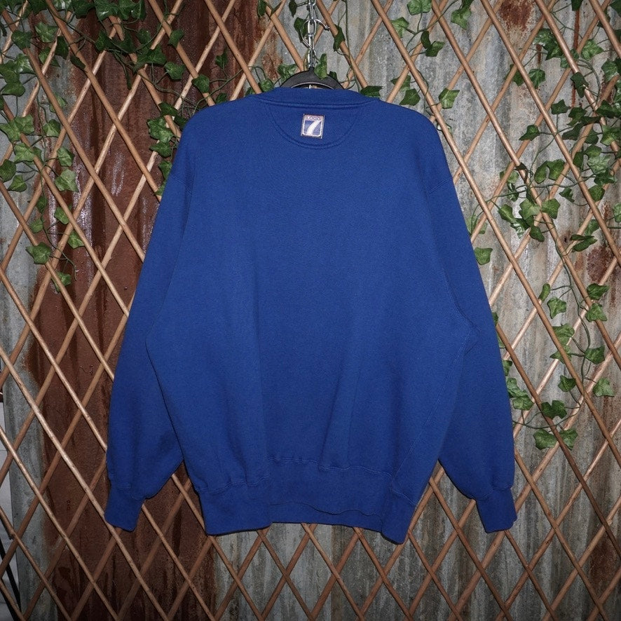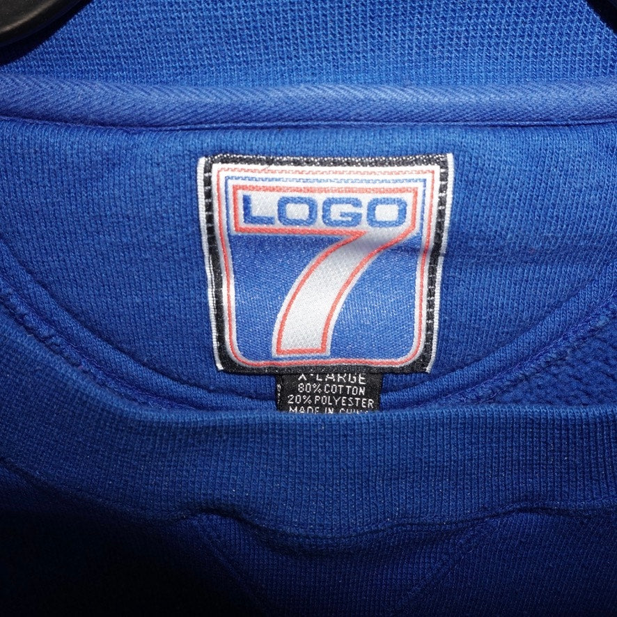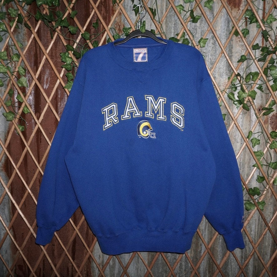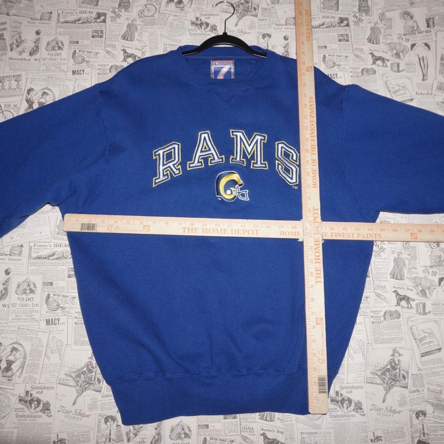 XL - Vintage / Y2K Los Angeles Rams spell out our logo collegiate style NFL football helmet on logo seven brand Tag blue heavyweight crewneck sweatshirt 1990s era Los Angeles, St. Louis