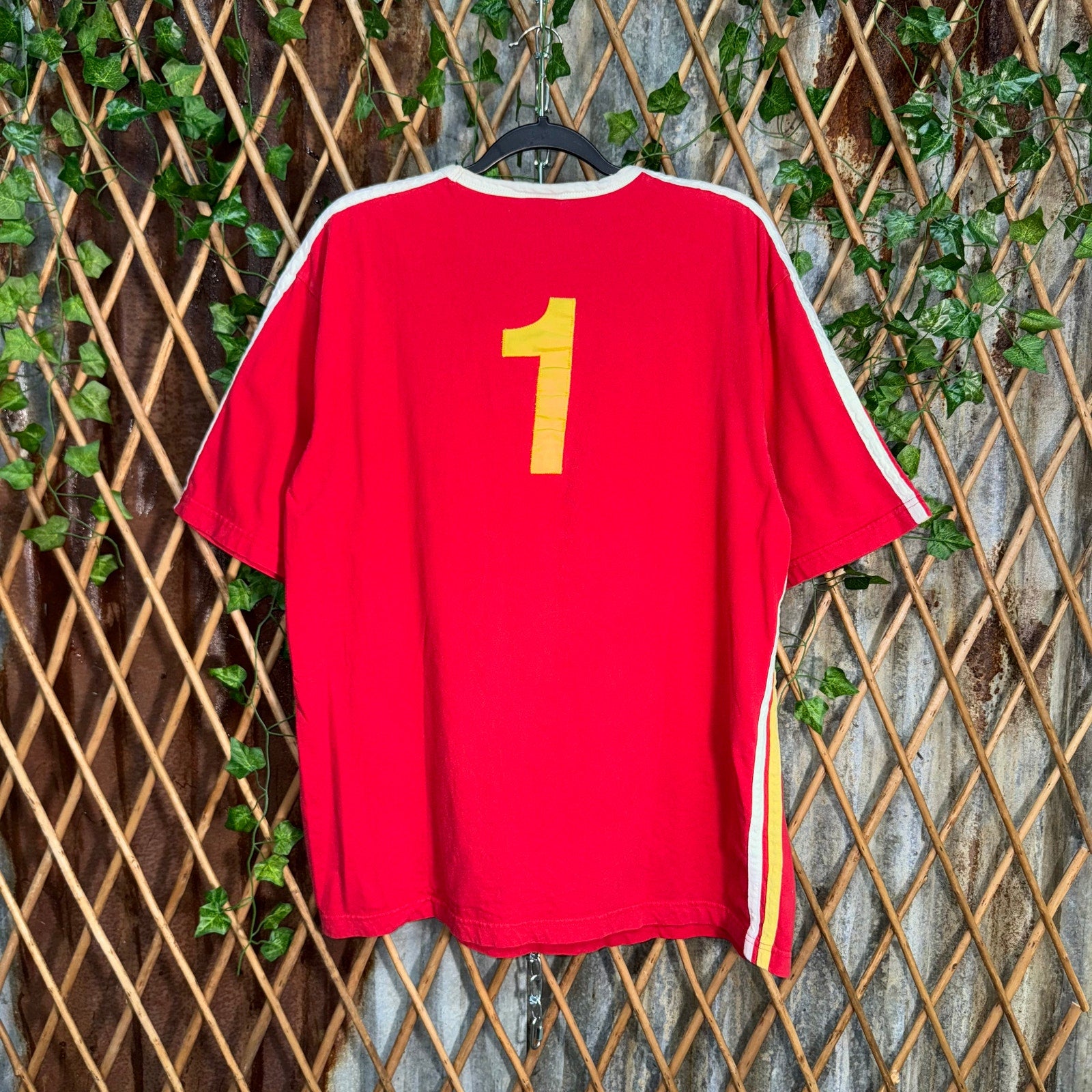 Vintage / Y2K espana Spain, soccer jersey style embroidered Patch red T-shirt with yellow/white accents on Tommy Hilfiger denim Tag front and back hit double-sided multiple graphic