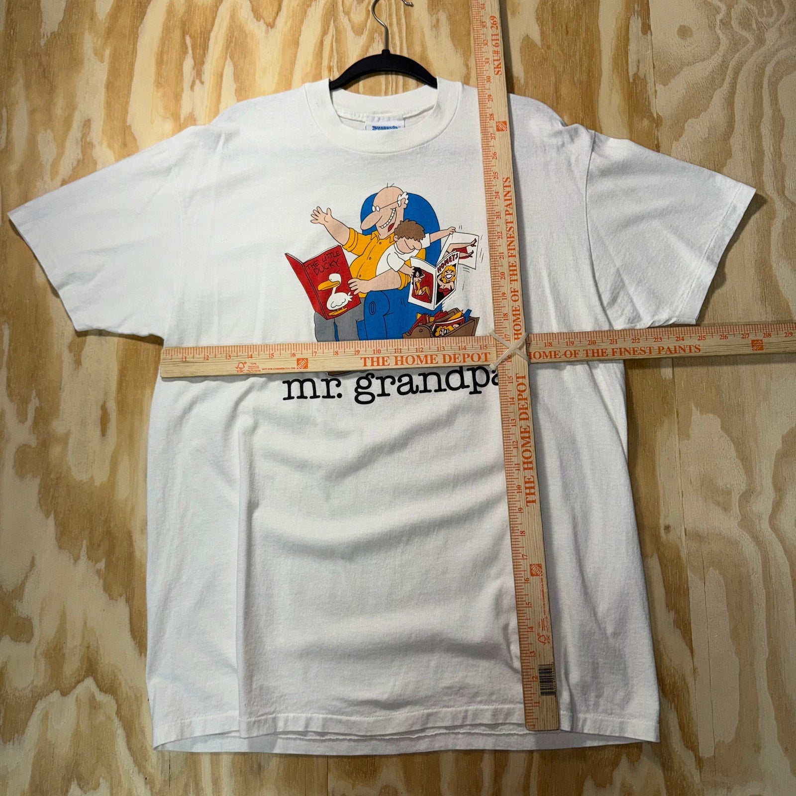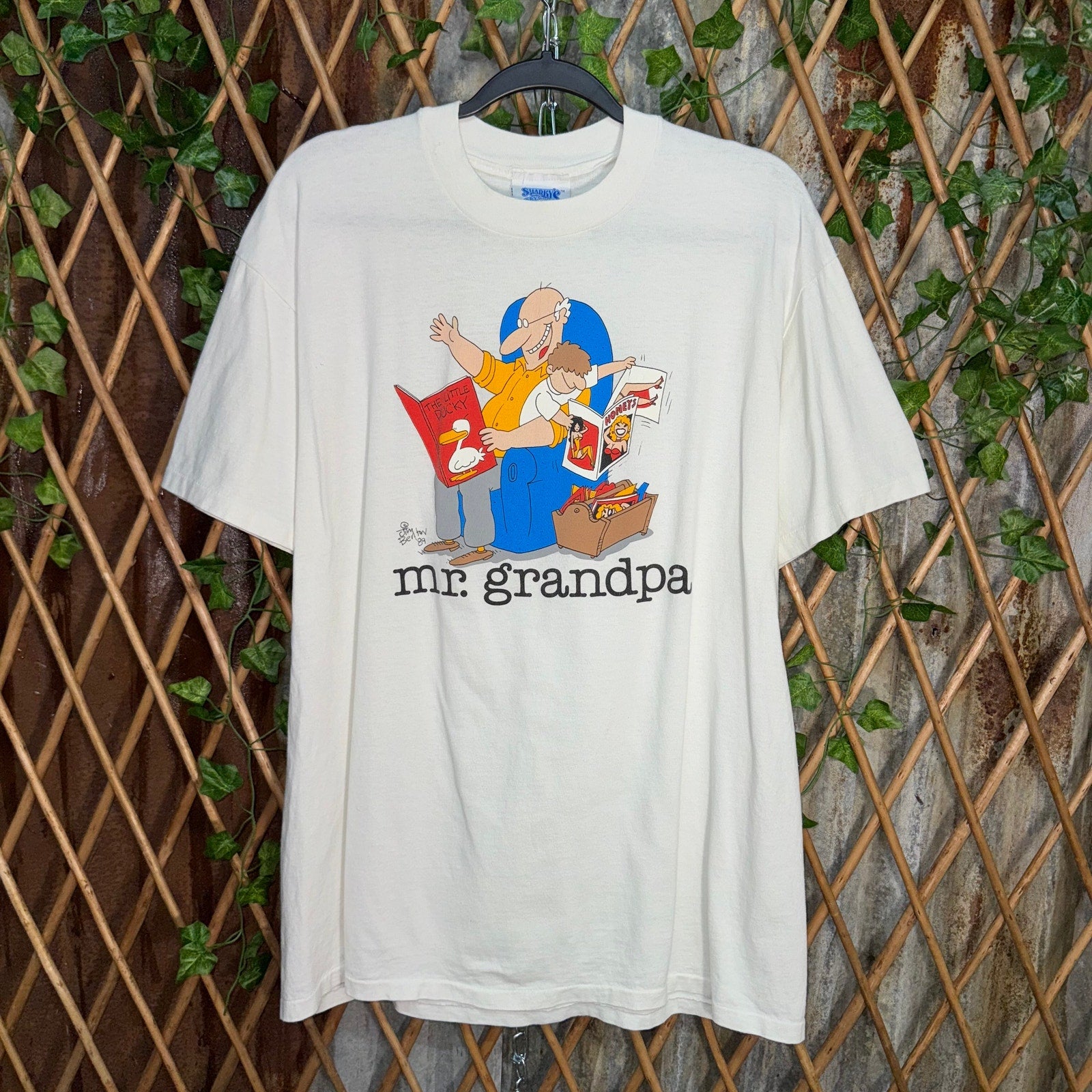 Vintage / Y2K mr. Grandpa jim Benton art licensed in dated 1989 character holding grandson reading book while grandson is reading Playboy style magazine funny humor comedy parody 1980s era on Stedman made in USA Tag white T-shirt