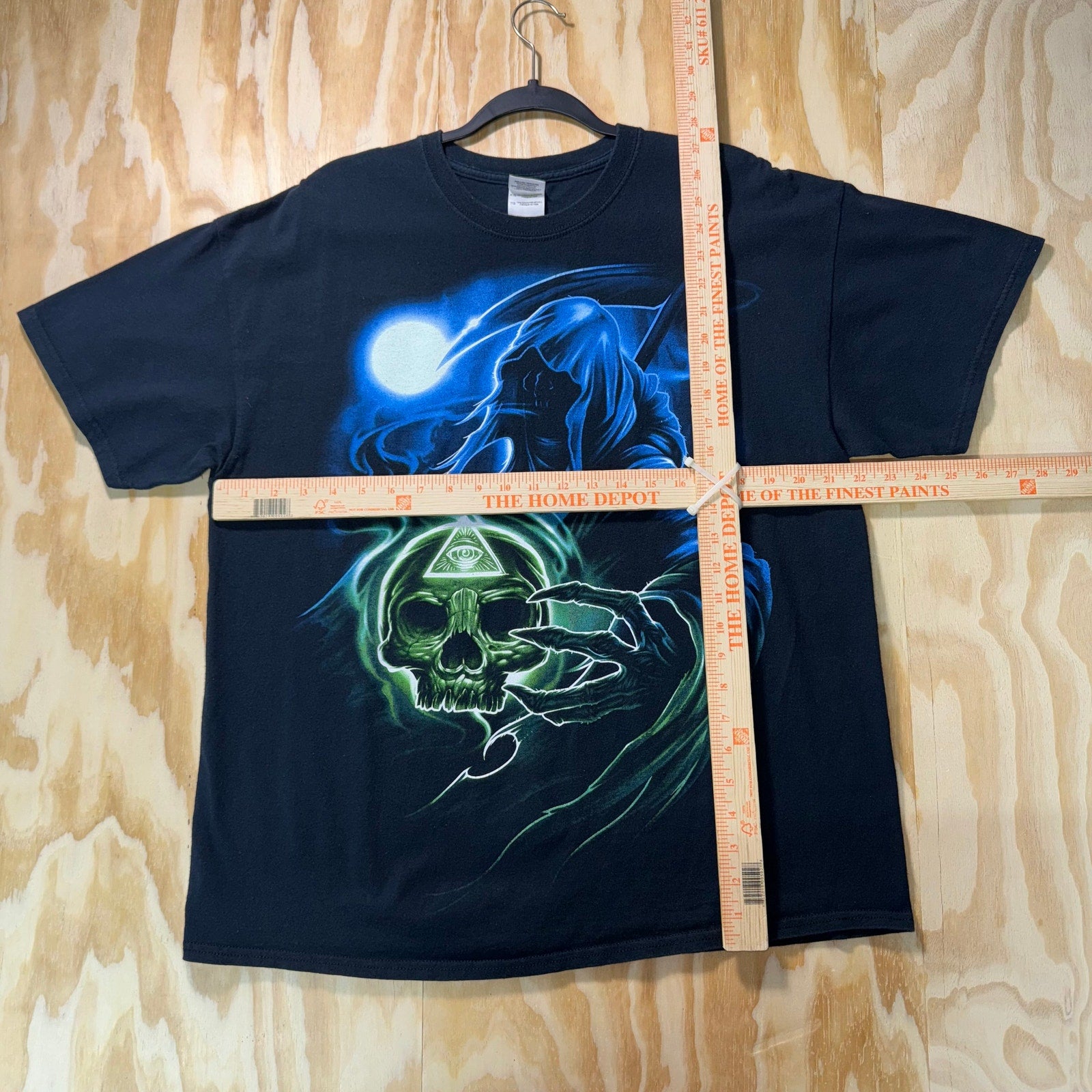 Vintage / Y2K grim Reaper holding scythe and skull with illuminati logo moon glowing backdrop, 2000’s era grunge, black T-shirt, Jesse Pinkman style