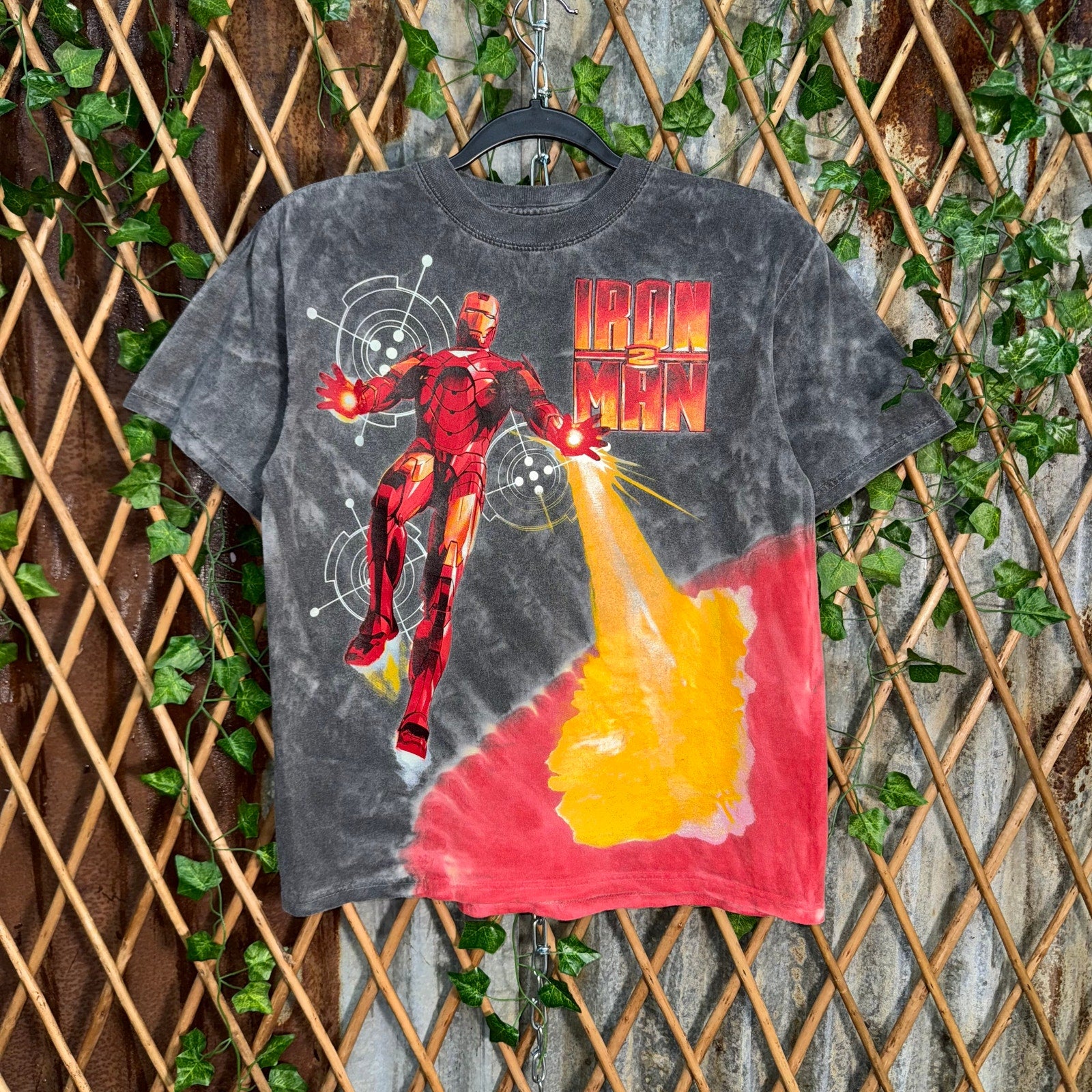 Vintage / Y2K Iron Man 2 movie promo 2010’s era essential superhero comic book, Marvel MCU whiplash war machine, tie-dye liquid blue Star Wars, Phantom Menace style graphic red/gray T-shirt youth size