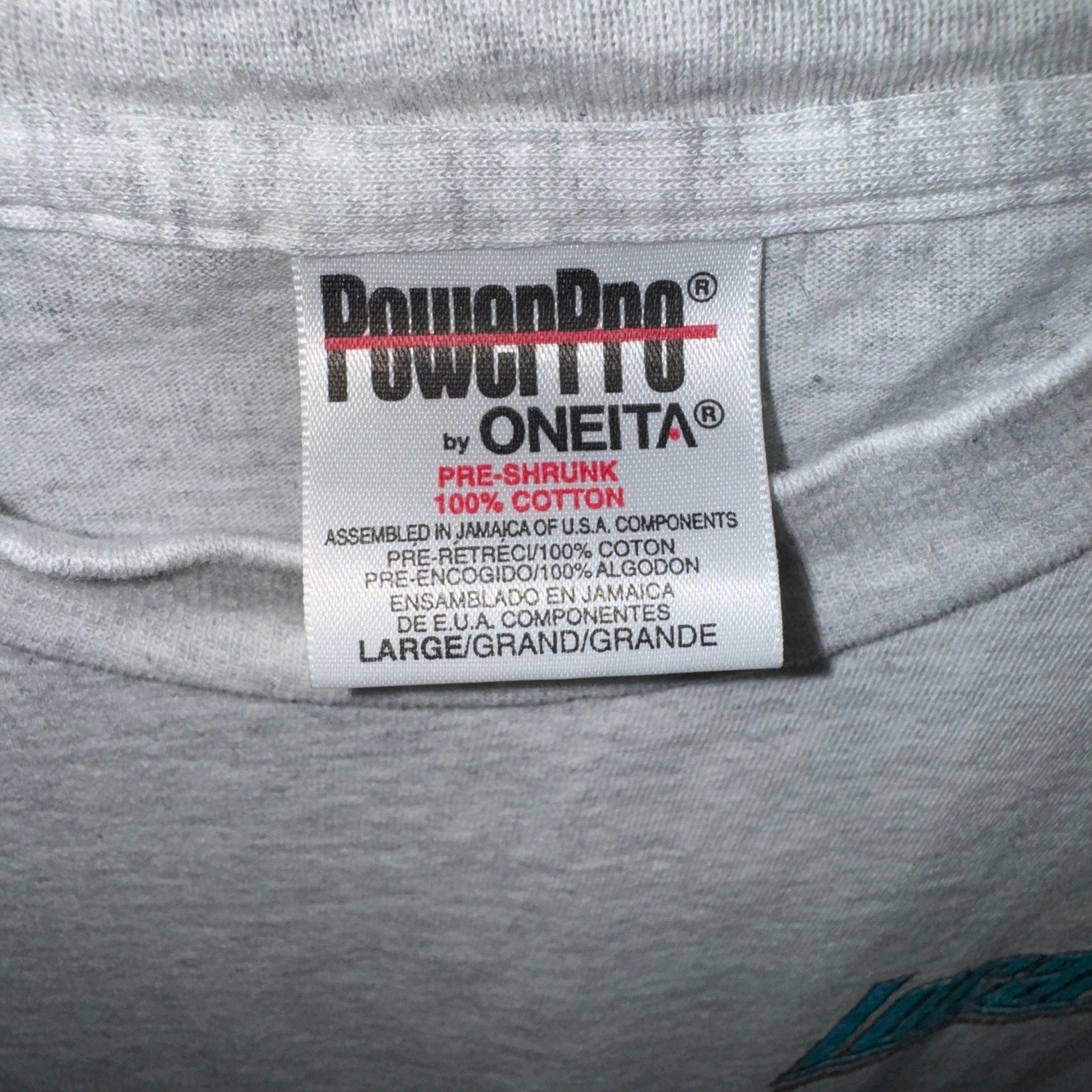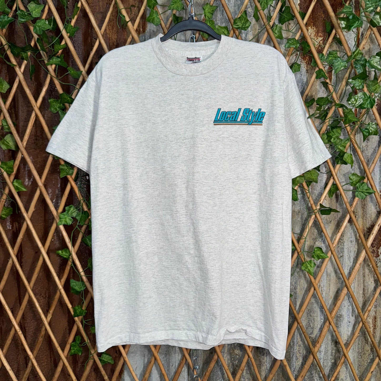 Vintage / Y2K local style front back hit double-sided multiple graphic on powerpro by oneita tag light Heather gray T-shirt 1990s era ono bass fish style Hawaii essential surf beach