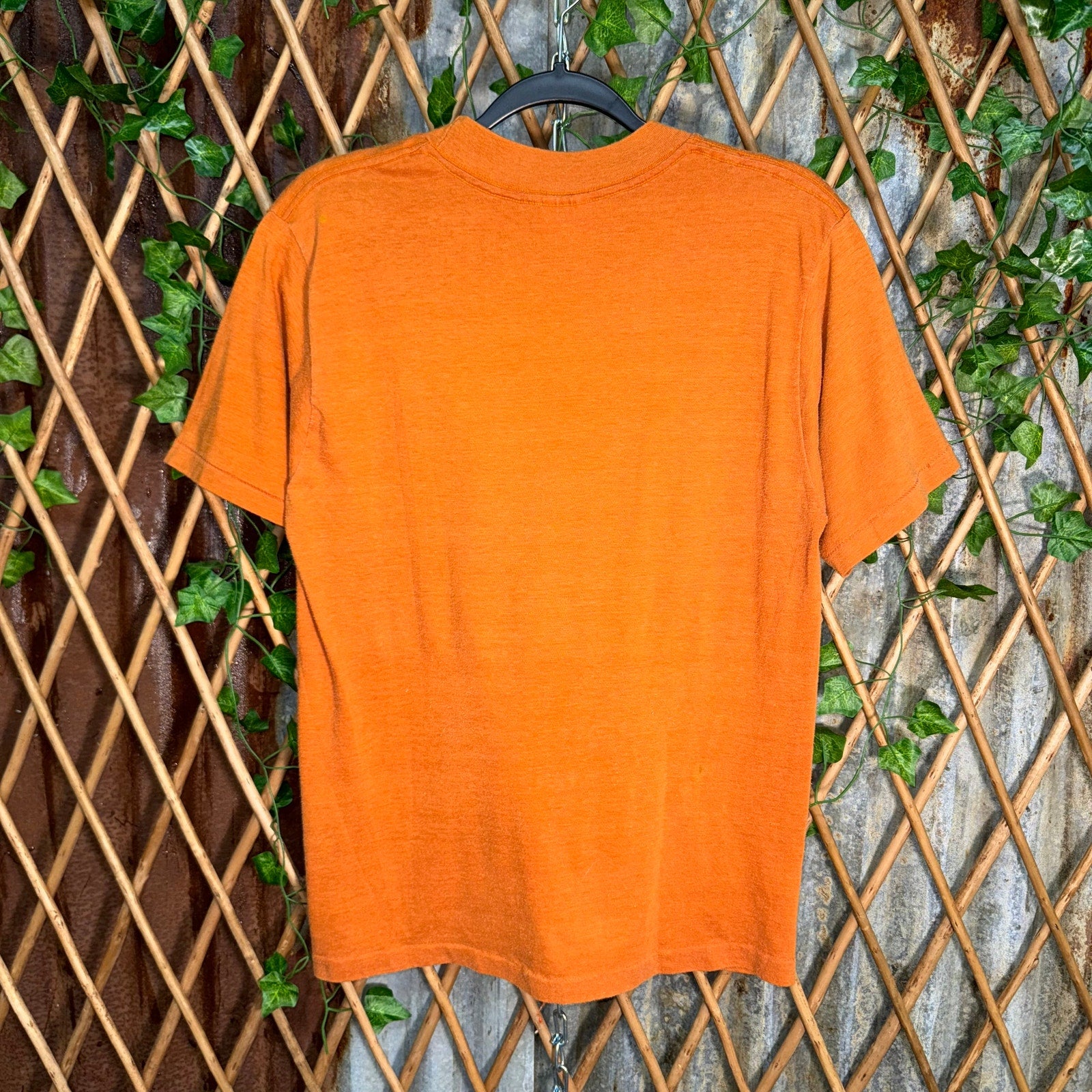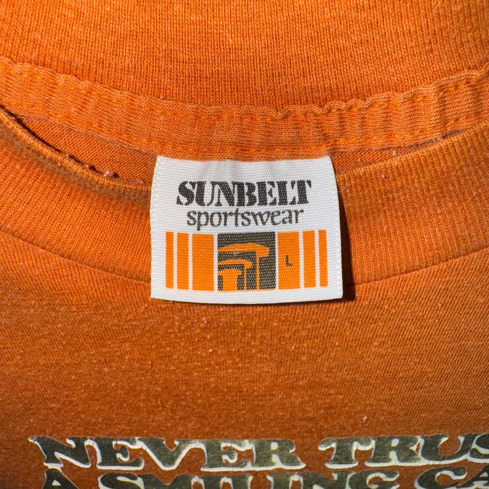 Vintage / Y2K never trust a smiling cat Garfield DTF graphic 1980s/1990s era single stitch Heather orange T-shirt on Sunbelt sportswear Tag made in USA essential Comic book tv show cartoon promo movie TEE essential