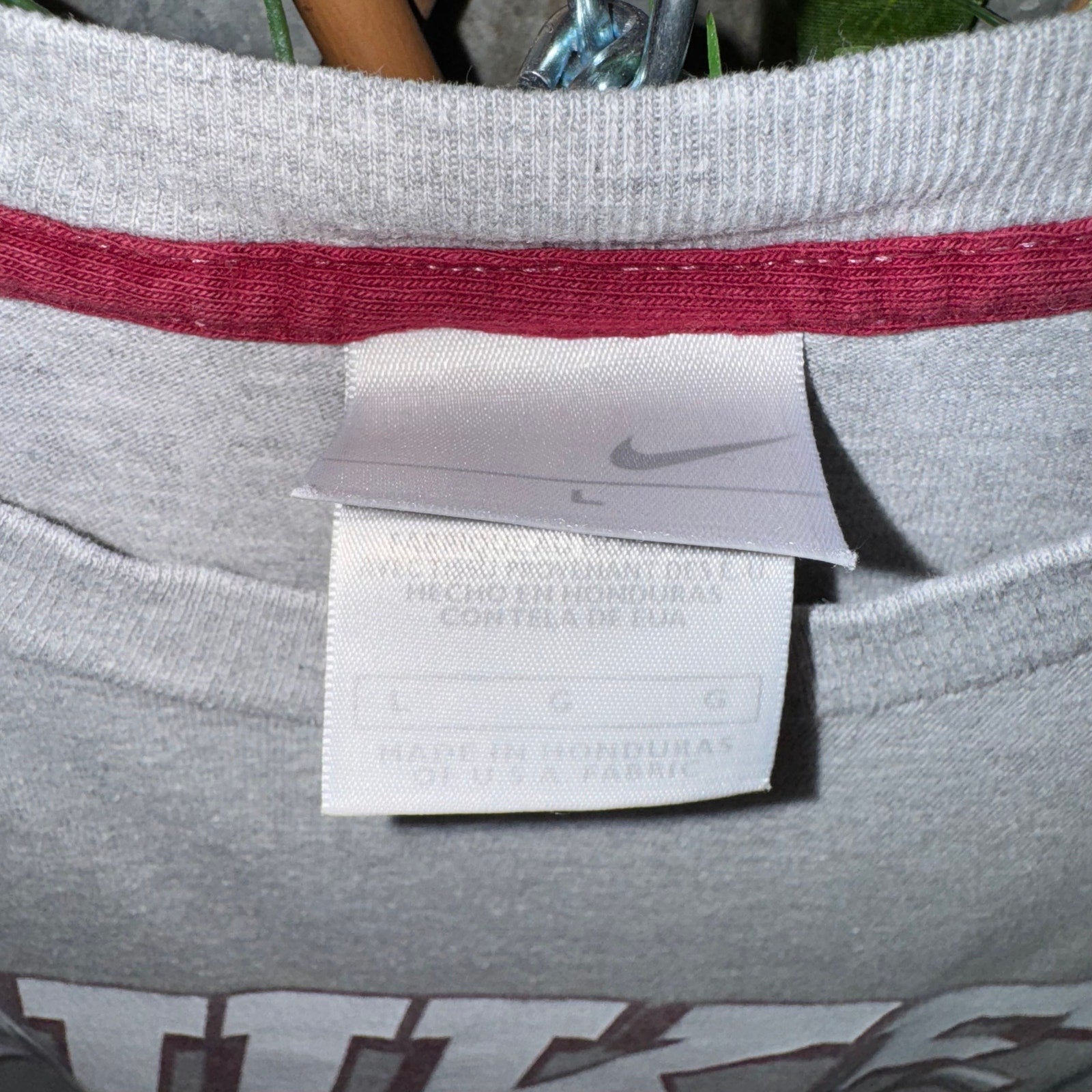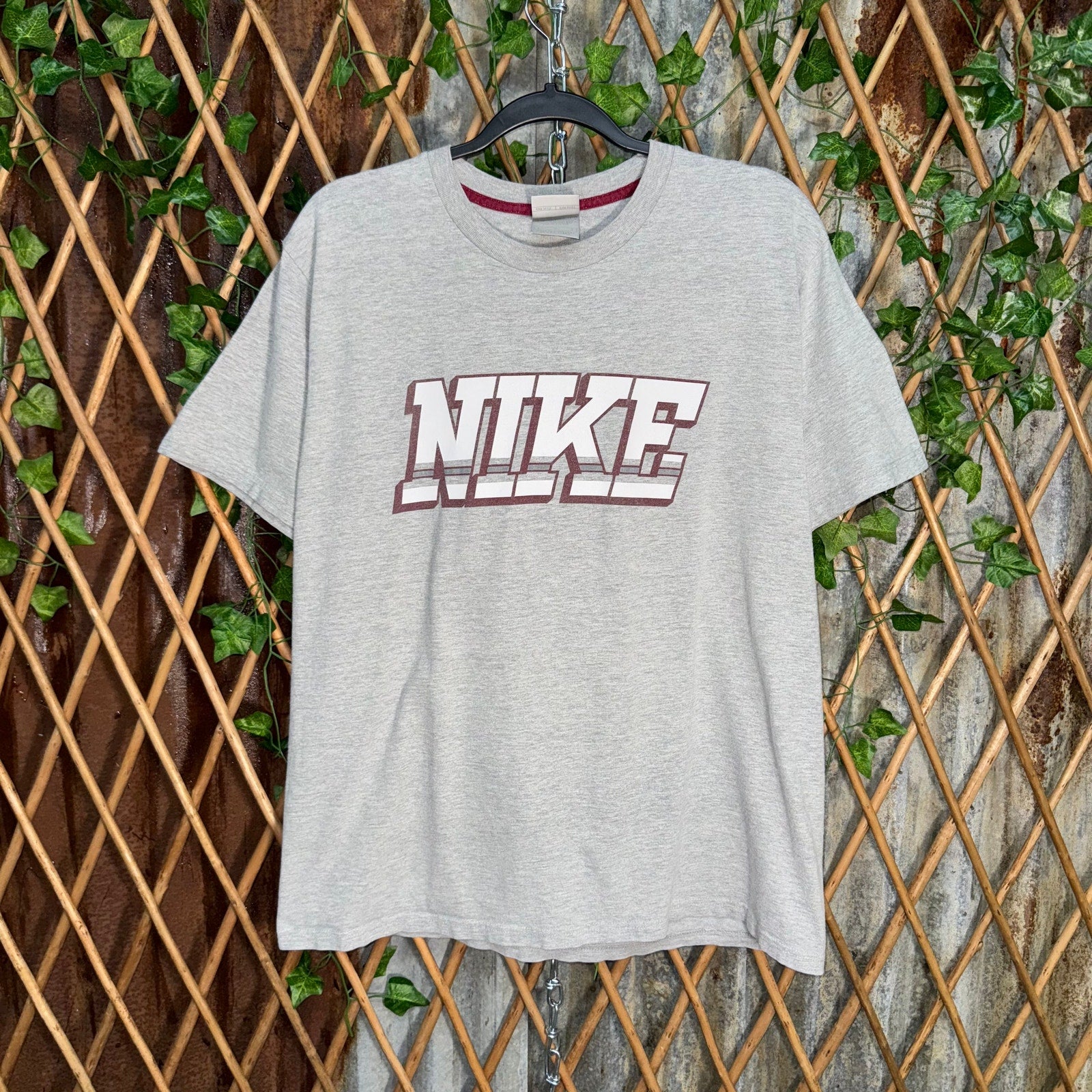 Vintage / Y2K Nike spell out maroon/burgundy accents stripe running through letters on gray tag essential 2000 era gray T-shirt sportswear style