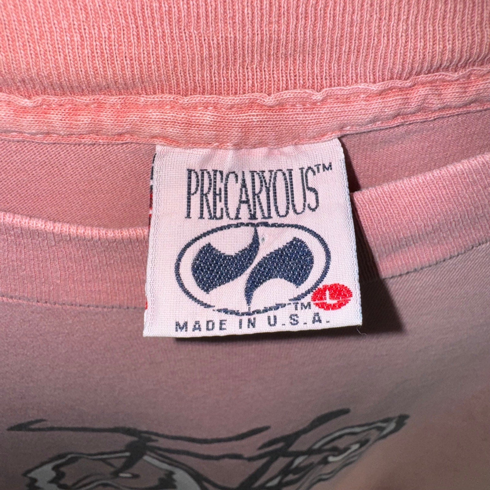 Vintage / Y2K precarious made in USA 1990s era faded pink, single stitch, top and bottom “ dirt is good, speed is good, scabs are good, life is good “ bicycle outdoor nature cycling style front and back hit double-sided multiple graphic