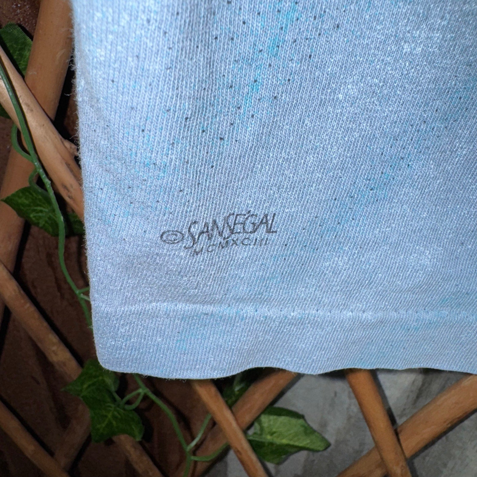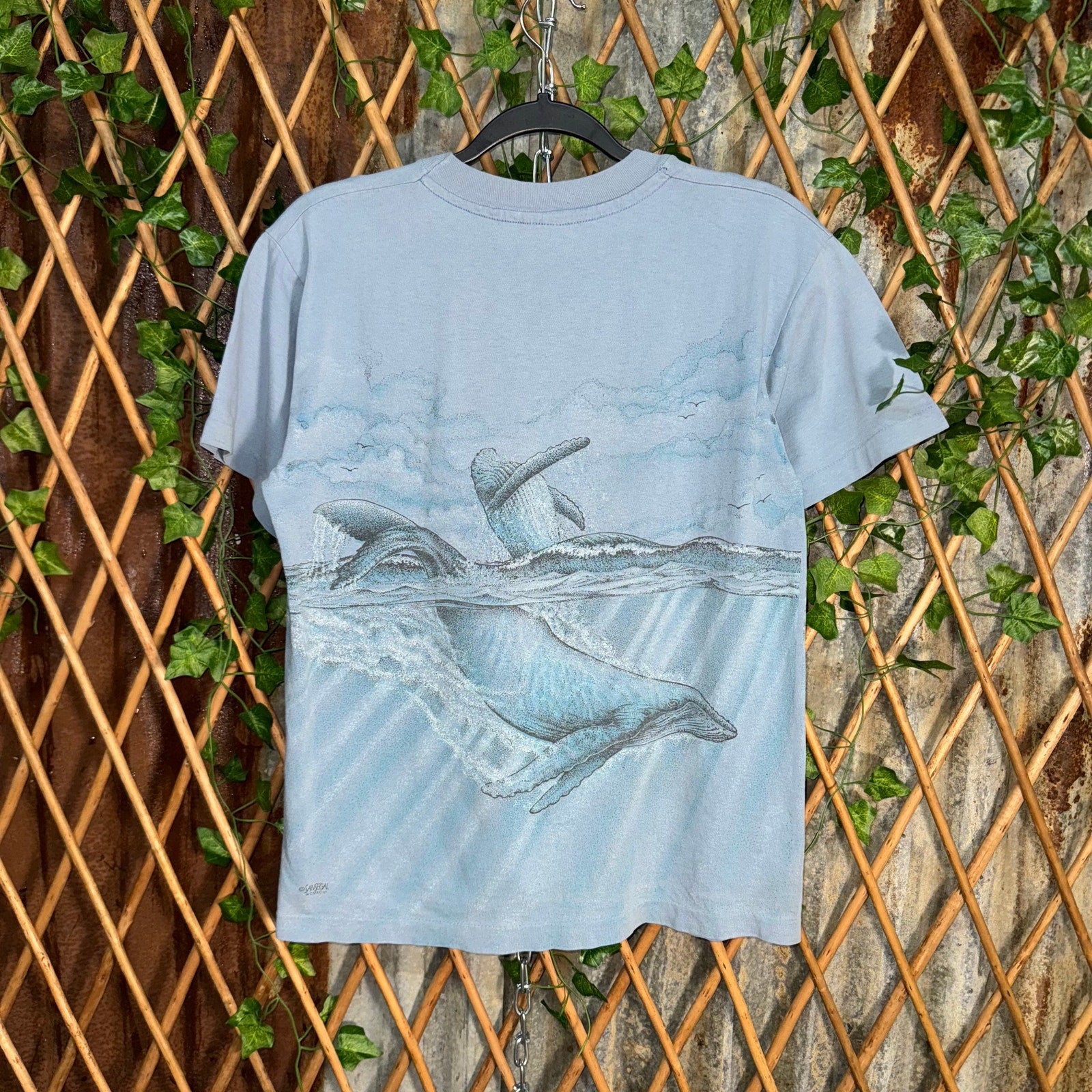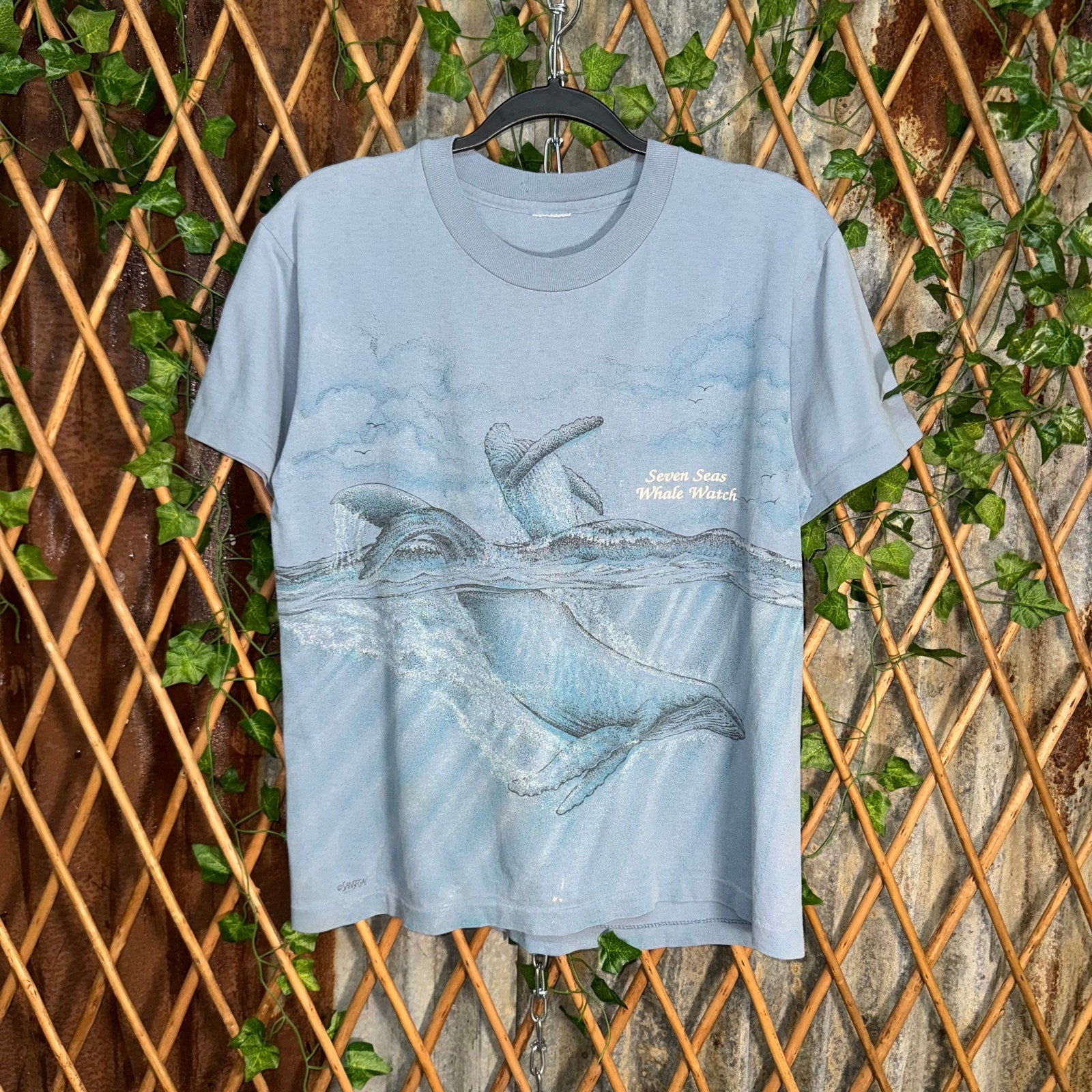 Vintage / Y2K seven seas whale watch museum, zoo, aquarium style T-shirt, AOP single stitch 1990s era, dolphin whale wraparound nature wildlife aquatic ocean faded blue T-shirt shirt license to SANSEGAL MCMXCIII / 1993