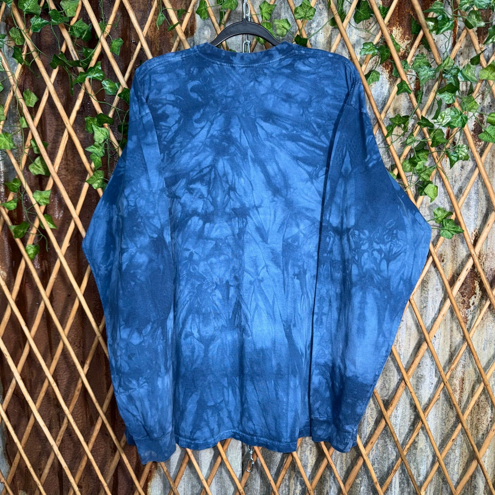 Vintage / Y2K the mountain tie-dye long sleeve blue T-shirt with native American woman and wolves howling at the moon in the snow forest backdrop 1990/2000’s era essential heavyweight super rare