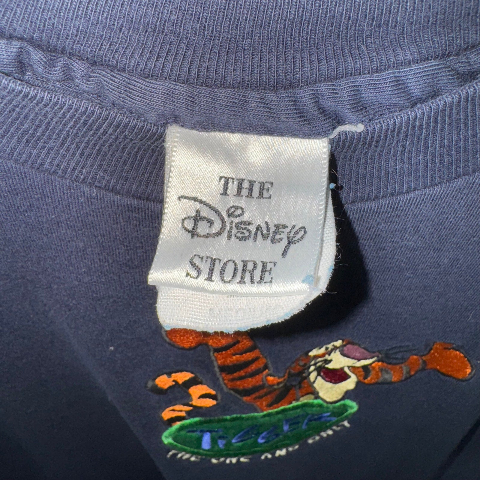 Vintage / Y2K Tigger, the one and only embroidered chest hit kid core Winnie the Pooh, Hunter digger for Disneyland on the Disney store Tag 1990/2000’s era single stitch top and bottom. Navy blue T-shirt.
