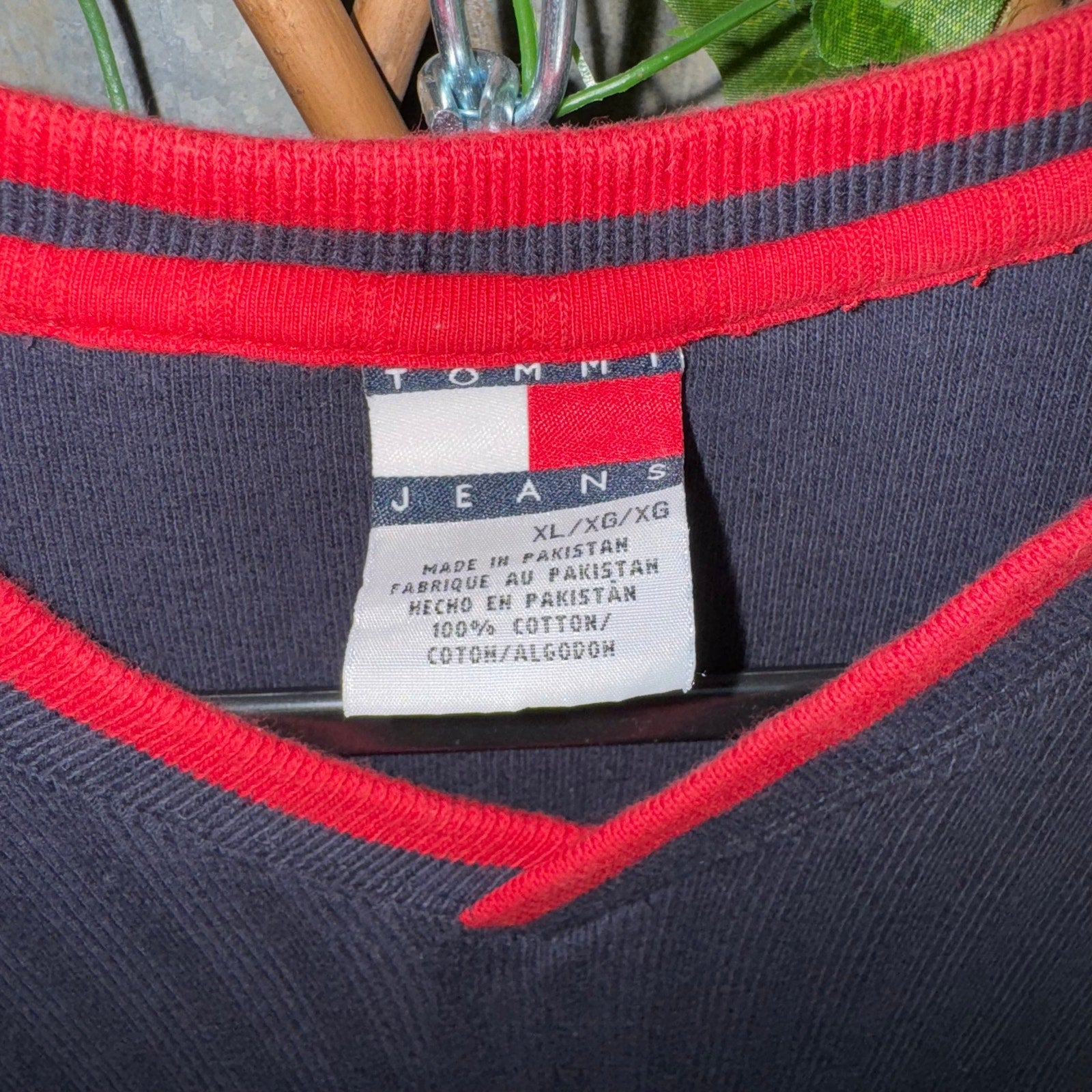 Vintage / Y2K Tommy Hilfiger embroidered logo striped navy blue shirt with V-neck red collar essential 2000 era preppy style