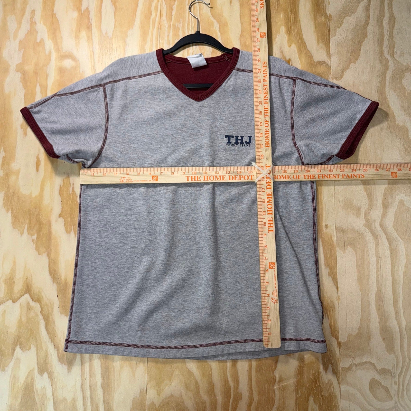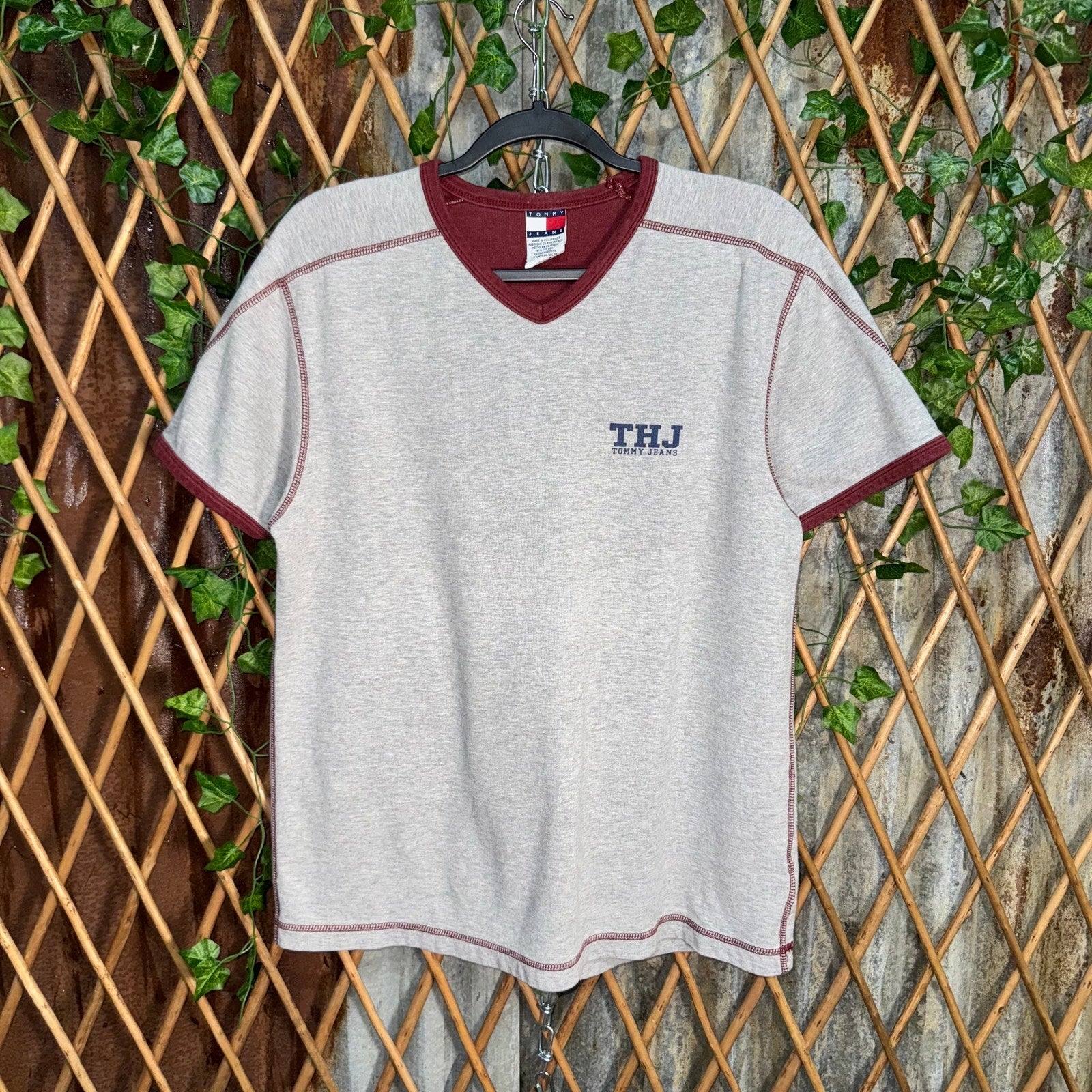 Vintage / Y2K THJ Tommy Hilfiger jeans, 2000 era reverse weave style gray T-shirt with maroon interior hip-hop style