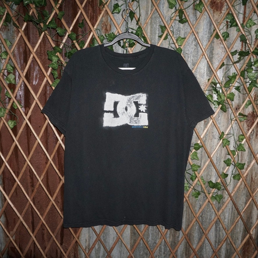 Large - Vintage / Y2K DC shoe co USA Droors clothing essential logo front hit shadow paint splatter style 2000 era skate/surf/snowboard style black T-shirt