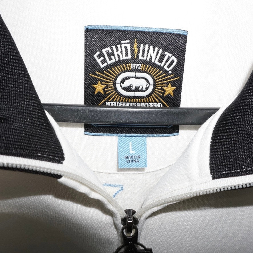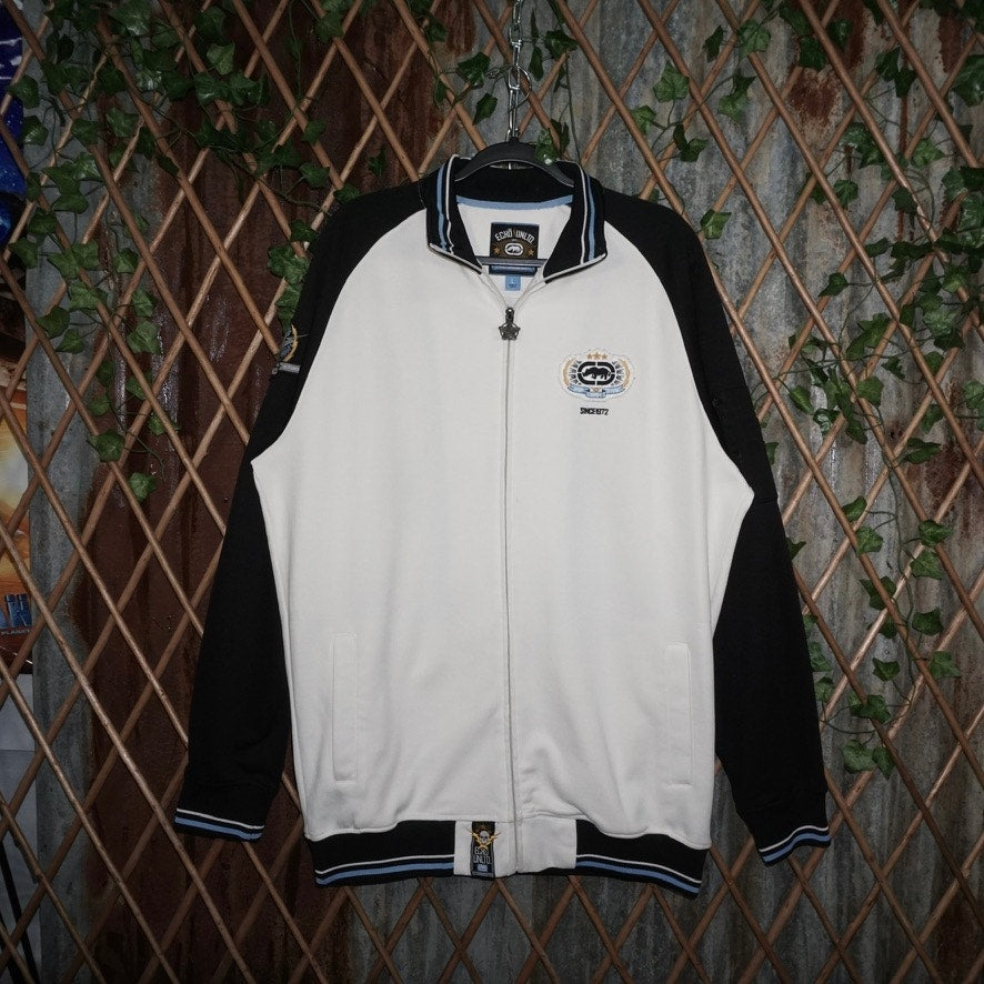 Large - Vintage / Y2K ECKO UNLTD rhino embroidered Patch graphic front sleeve hit track jacket zip up collared polo style, crazy back hit skull microphone, angel, wings, flags gears, diamonds, stars essential white/black/baby blue colorway