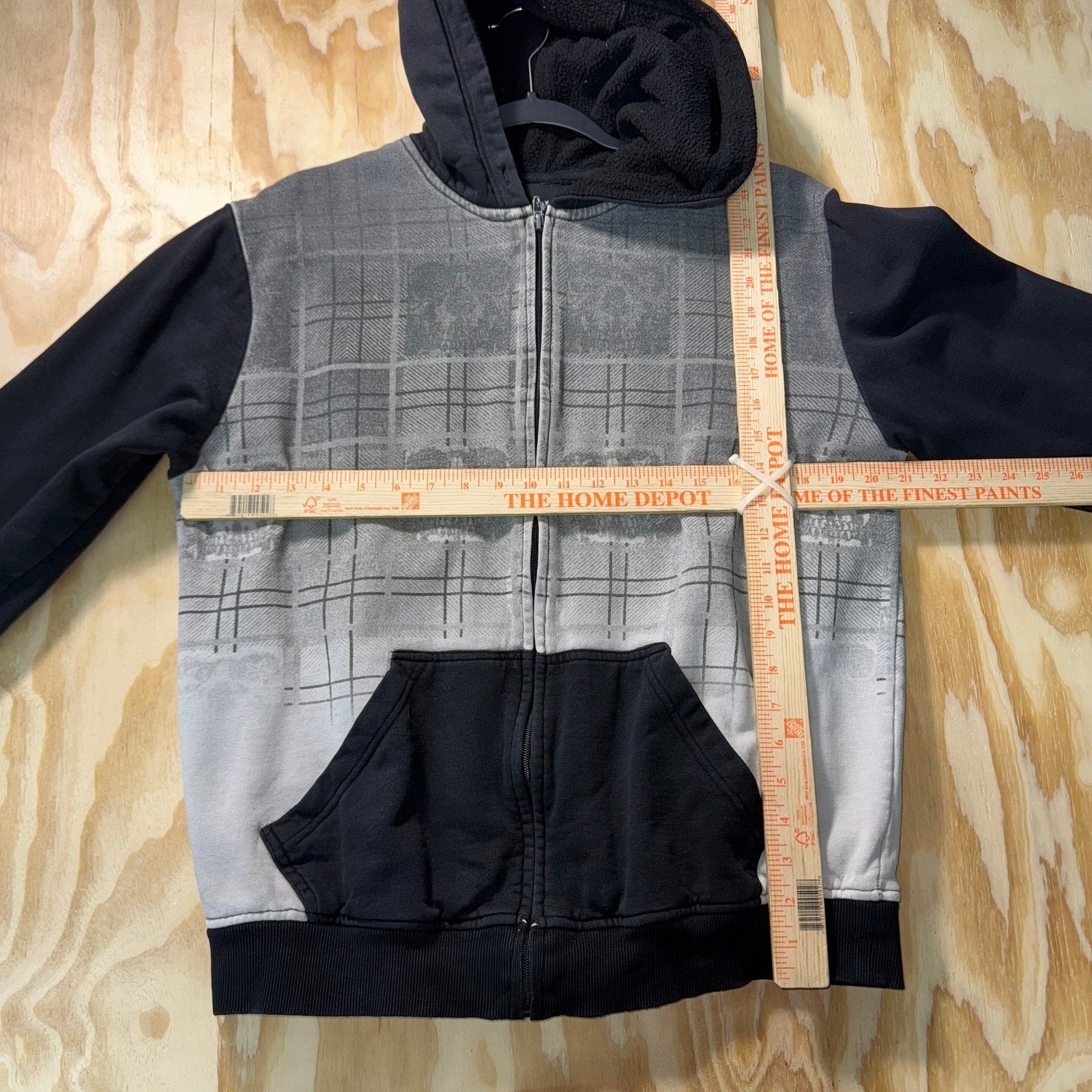 Vintage / Y2K hybrid, apparel, nautical star logo plaid style zip up hoodie, hooded sweatshirt 2000’s era jesse pinkman styles skull skeleton, graphic black/gray Galway front back double-sided multiple graphic lease lined hood two tone gradient, hoodie essential
