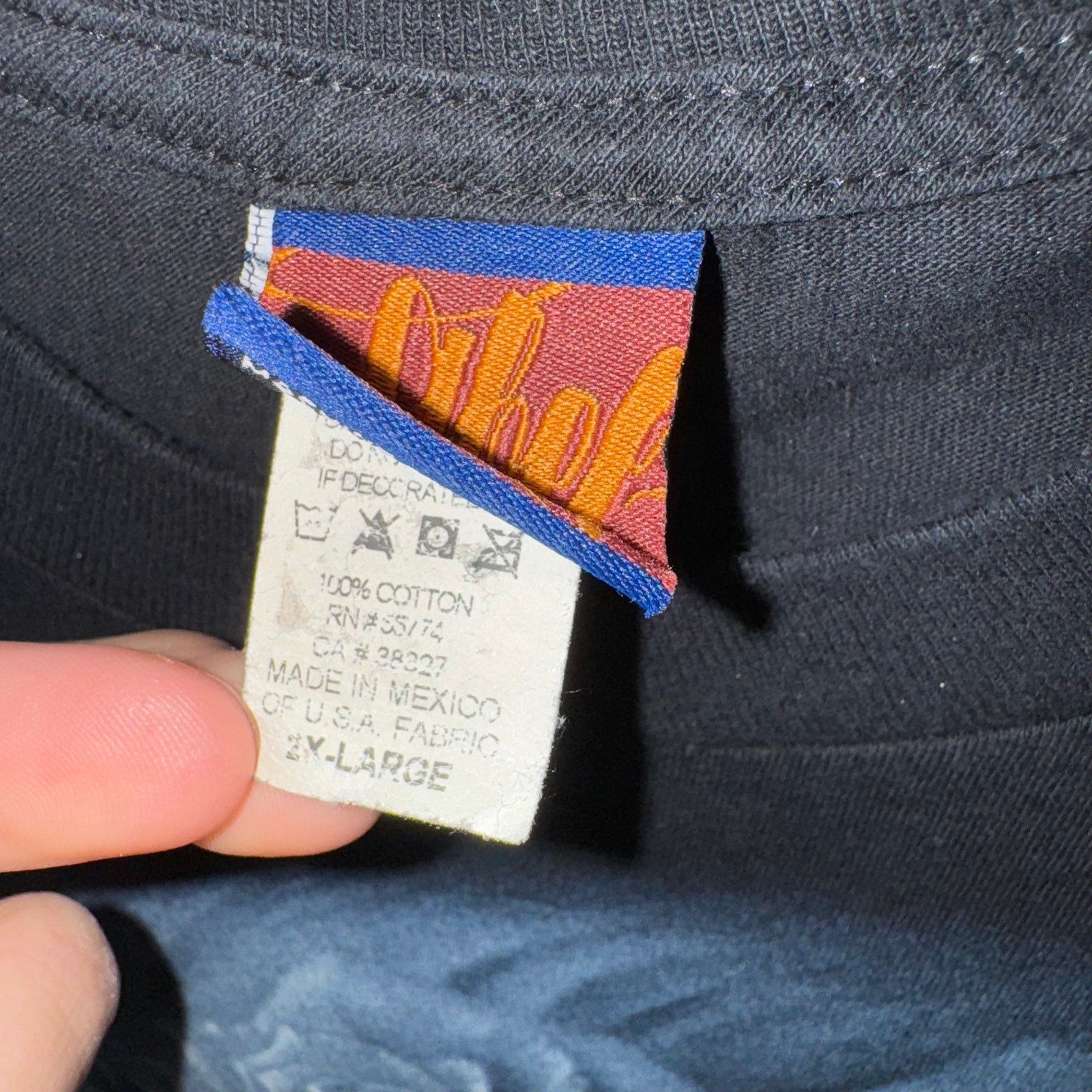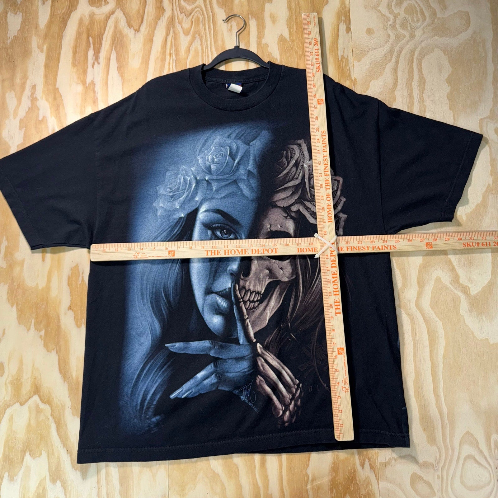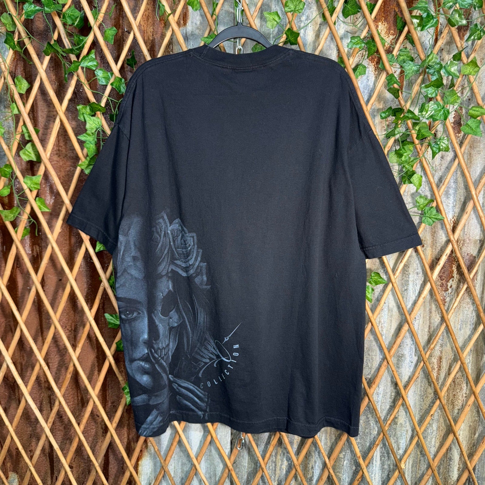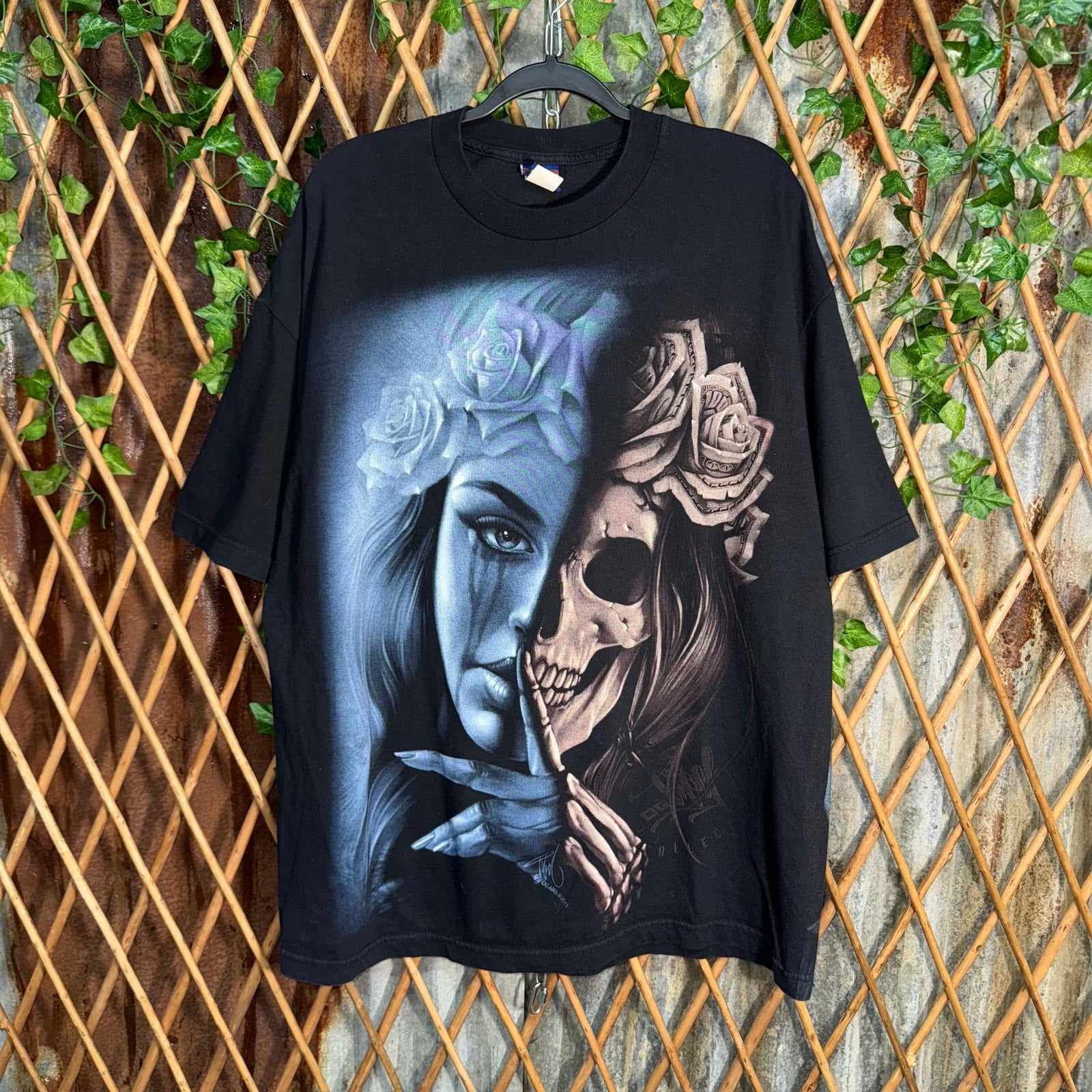 Vintage / Y2K native tribal style graphic, two face crying pin up girl style with flowers on her head skull skeleton hundred dollar bills, front and back double sided multiple graphic on OG Abel tag grunge 2000s era, Chicano, Chicana, Mexico, heritage black T-shirt, essential hip-hop style