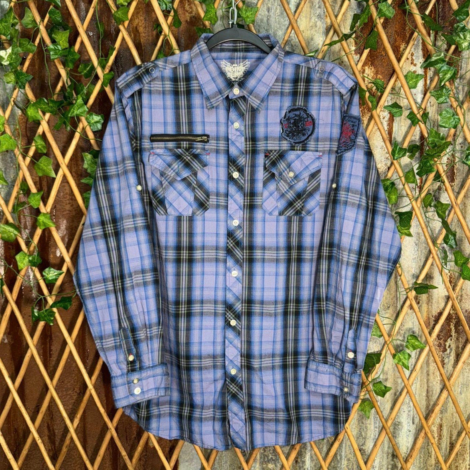 Vintage / Y2K point zero plaid flannel button up tactical style embroidered patch, raw hem grunge style 2000 hip-hop mall goth Jesse Pinkman style