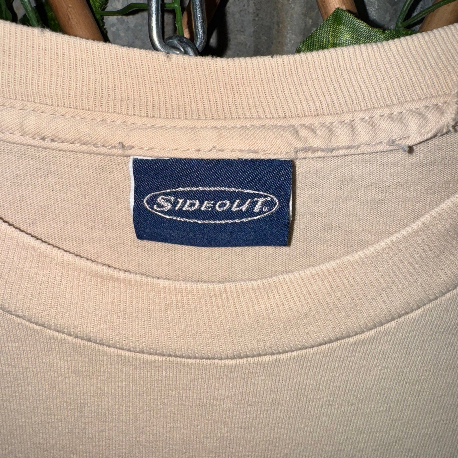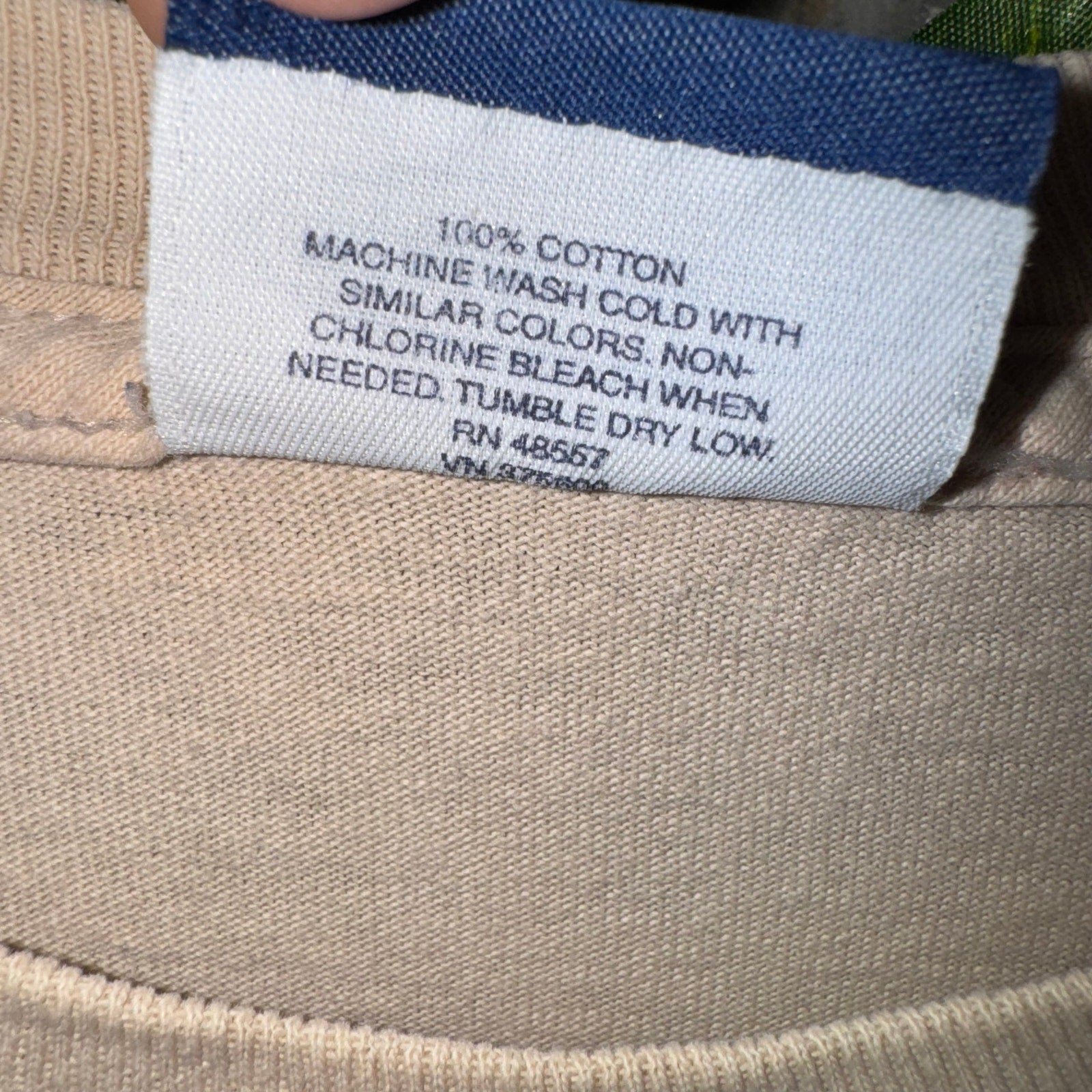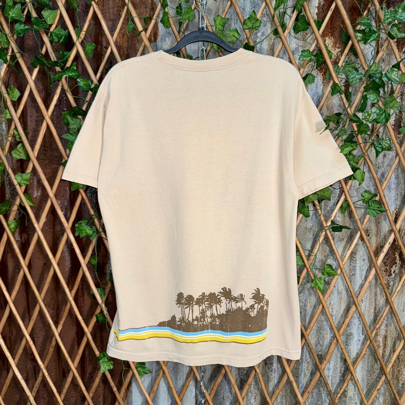Vintage / Y2K side out surf style horizontal stripe with palm tree, beach, graphic spell out front and back hit wrap around double-sided multiple graphic skate/grunge hip-hop 00s era beige/off-white color T-shirt essential