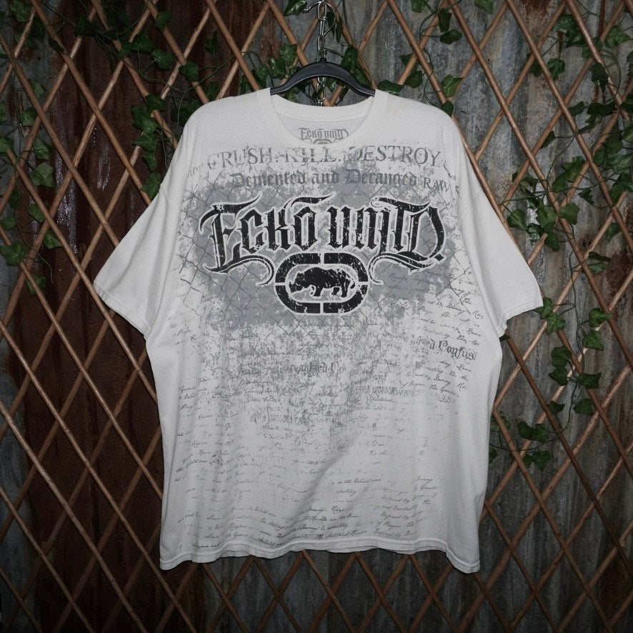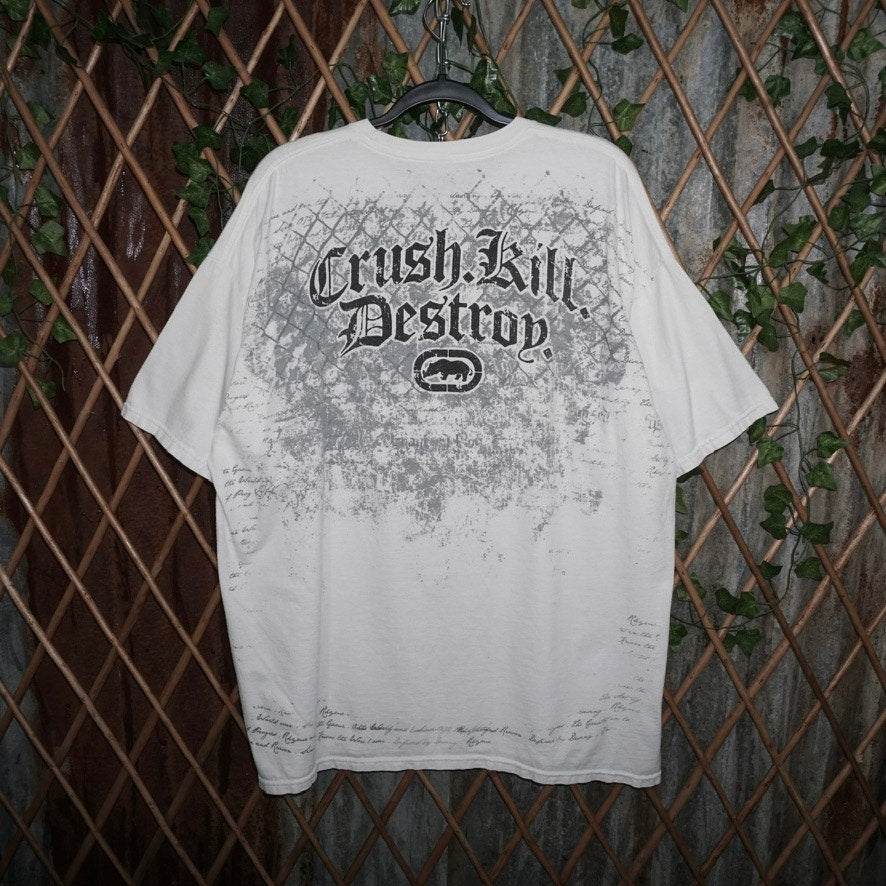XXL - Vintage / Y2K ECKO UNLTD. White T-shirt, chain-link fence, grunge crush, kill, destroy demented and deranged raw tap out style 2000s era grunge MMA UFC style. Essential frame packet, double-sided, multiple graphic, crushed kill, destroyed rhino.