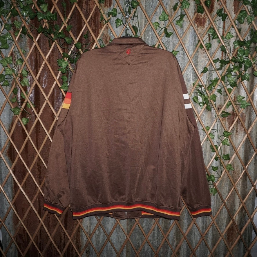 XXL - Vintage / Y2K ROCAWEAR Jay Z brand hip-hop rapper zip up track jacket super cool brown color way with red/orange/yellow accents, horizontal stripe white piping ROC ROCAFELLA embroidered logo essential 2000’s era New York style