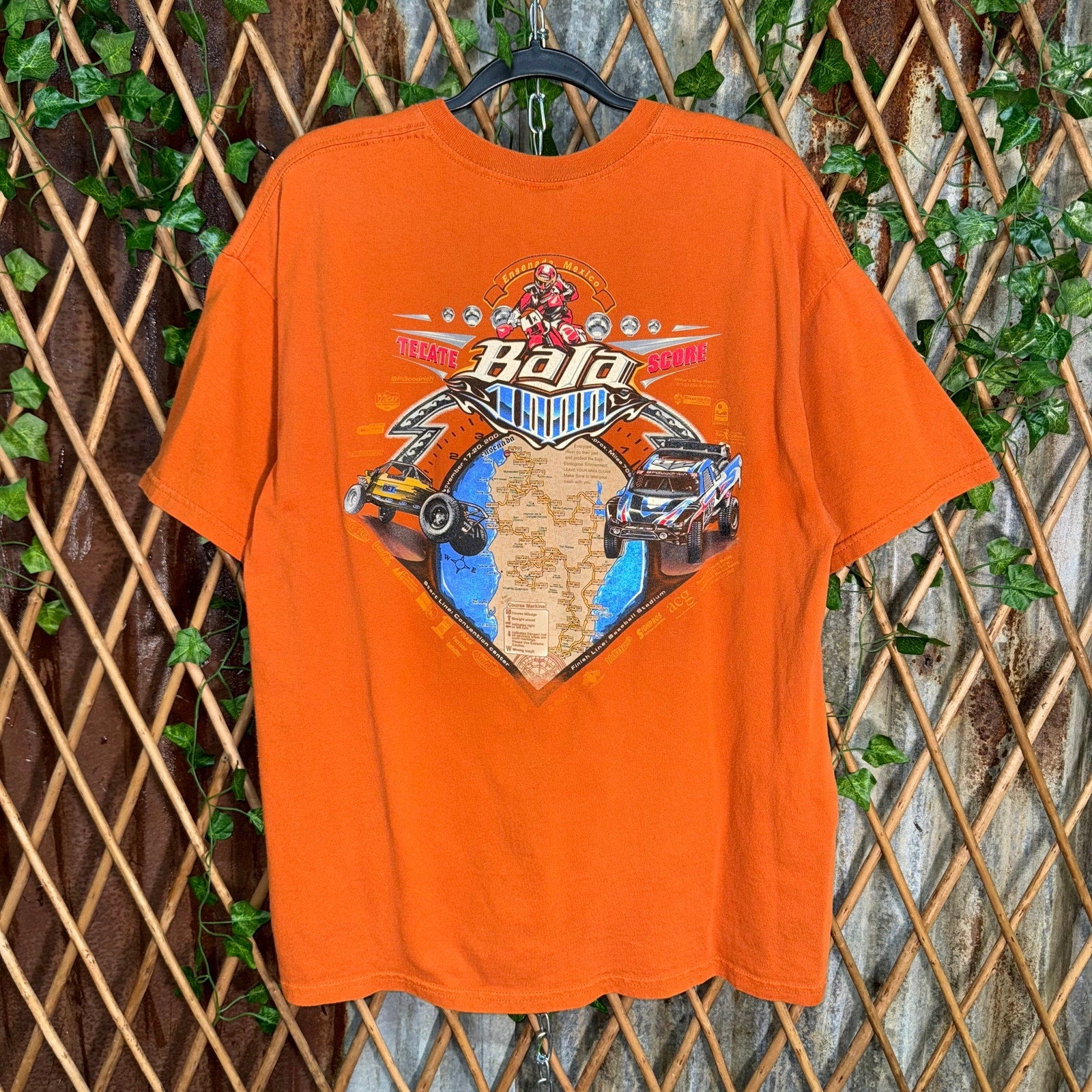Vintage / Y2K Baja Ensenada Mexico, 2005 Orange T-shirt sponsored by Tecate off-road classic racing NASCAR style ATV truck front and back hit double side of multiple graphic