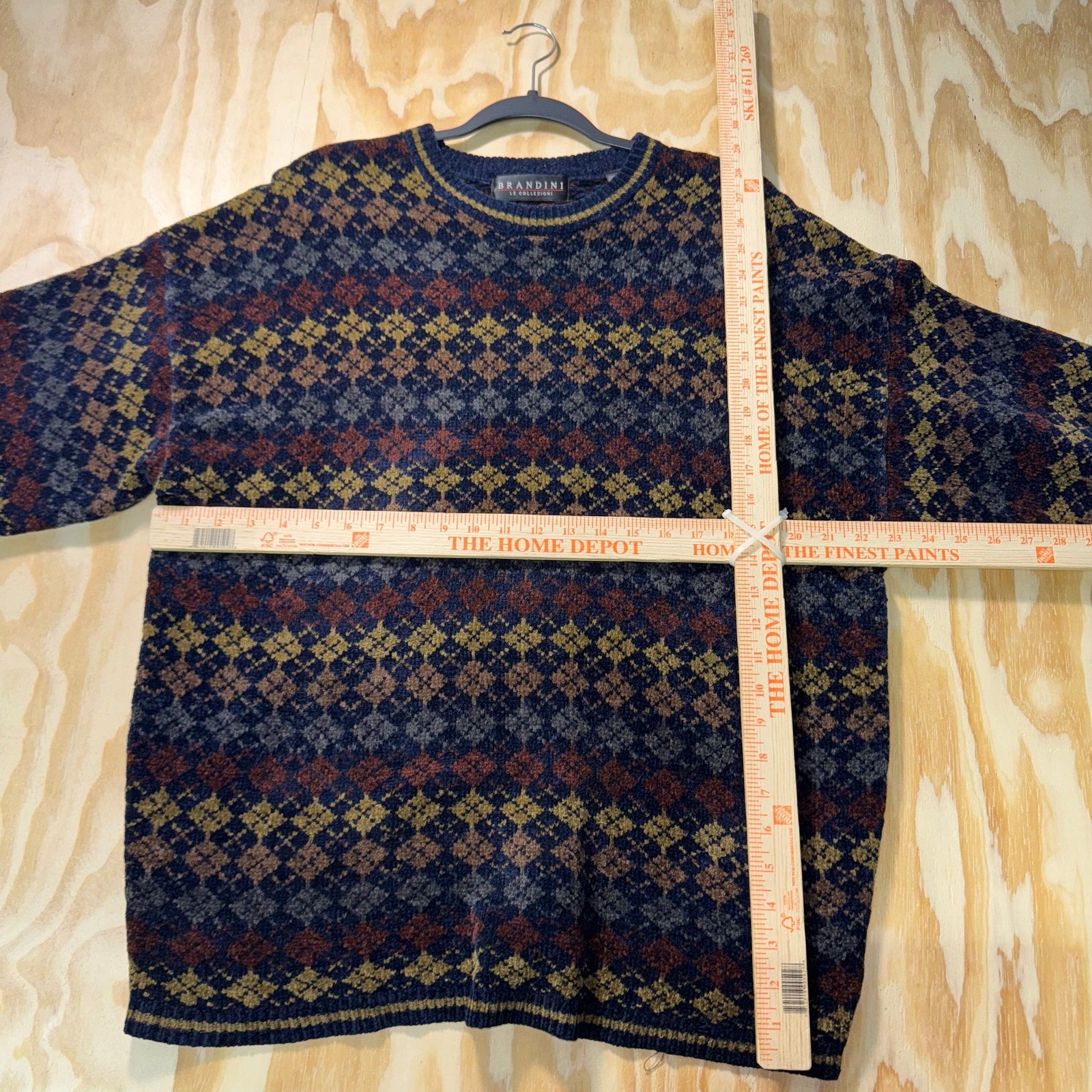 Vintage / Y2K brandini le collezion knitted pattern acrylic sweater, abstract style navy blue with yellow orange brown green accents front back head double sided multiple graphic essential