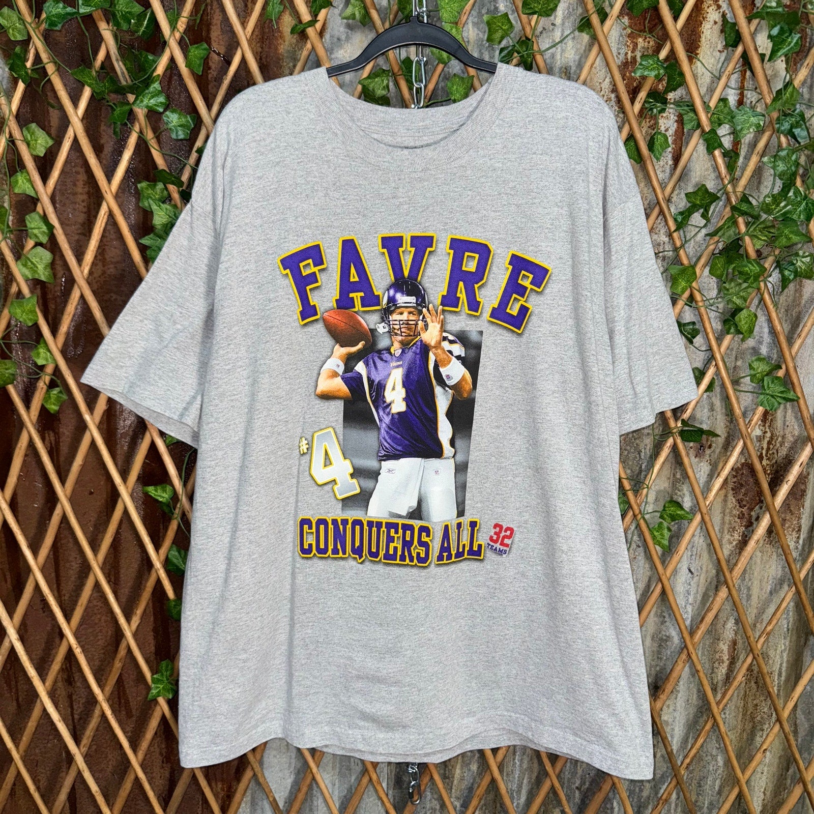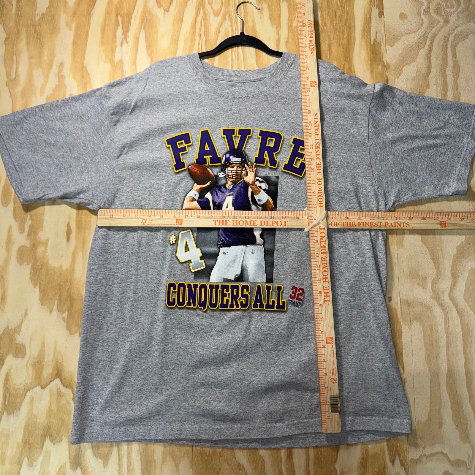 Vintage / Y2K Brett Favre # 4 conquers all 32 teams Monday night, October 5, 2009. Indianapolis Colts, Baltimore Ravens, Cincinnati Bengals New Orleans Saints, Pittsburgh Steelers, Miami Dolphins, Philadelphia Eagles San Francisco 49ers, Atlanta Falcons Arizona Cardinals Carolina Panthers New York Jets, Houston Texans Buffalo Bills, Jacksonville Jaguars, Dallas Cowboys, Cleveland Browns Detroit Lions Tennessee Titans, Kansas City Chiefs Washington commanders old logo, st. Louis Rams, Minnesota Vikings, New England Patriots, New York Giants, Seattle Seahawks, Oakland Raiders Denver Broncos, Chicago Bears, Tampa Bay Buccaneers, San Diego Chargers, Green Bay Packers. Gray T-shirt 2000’s era. NFL football sportswear