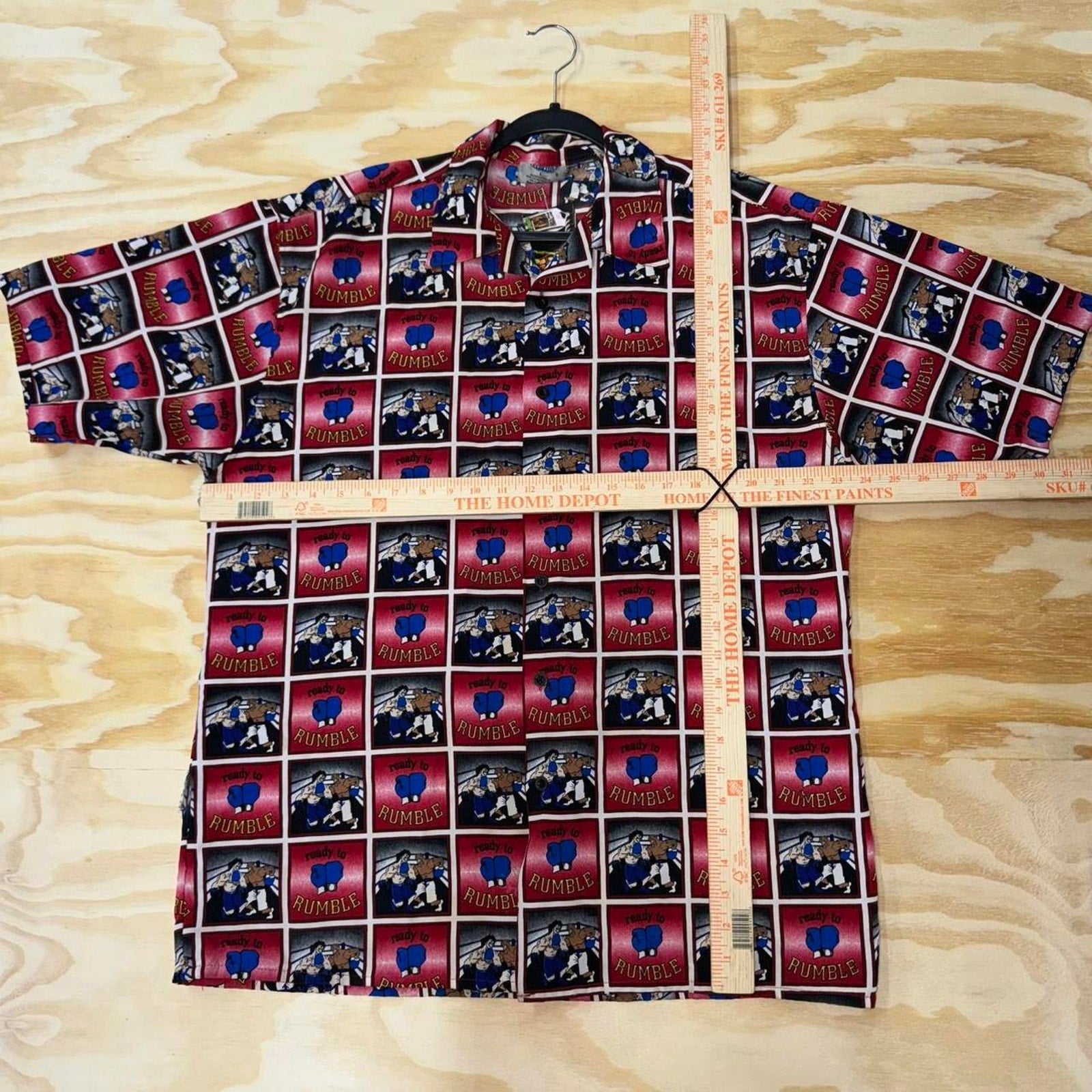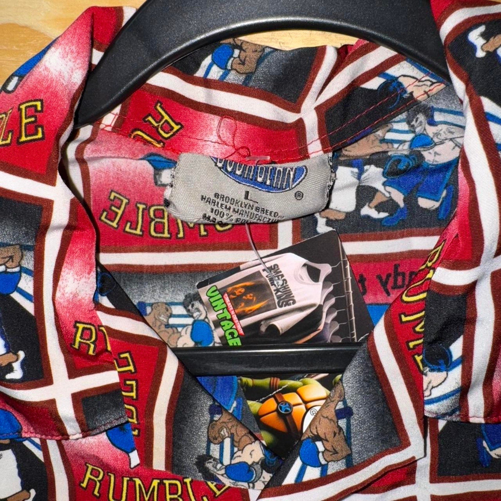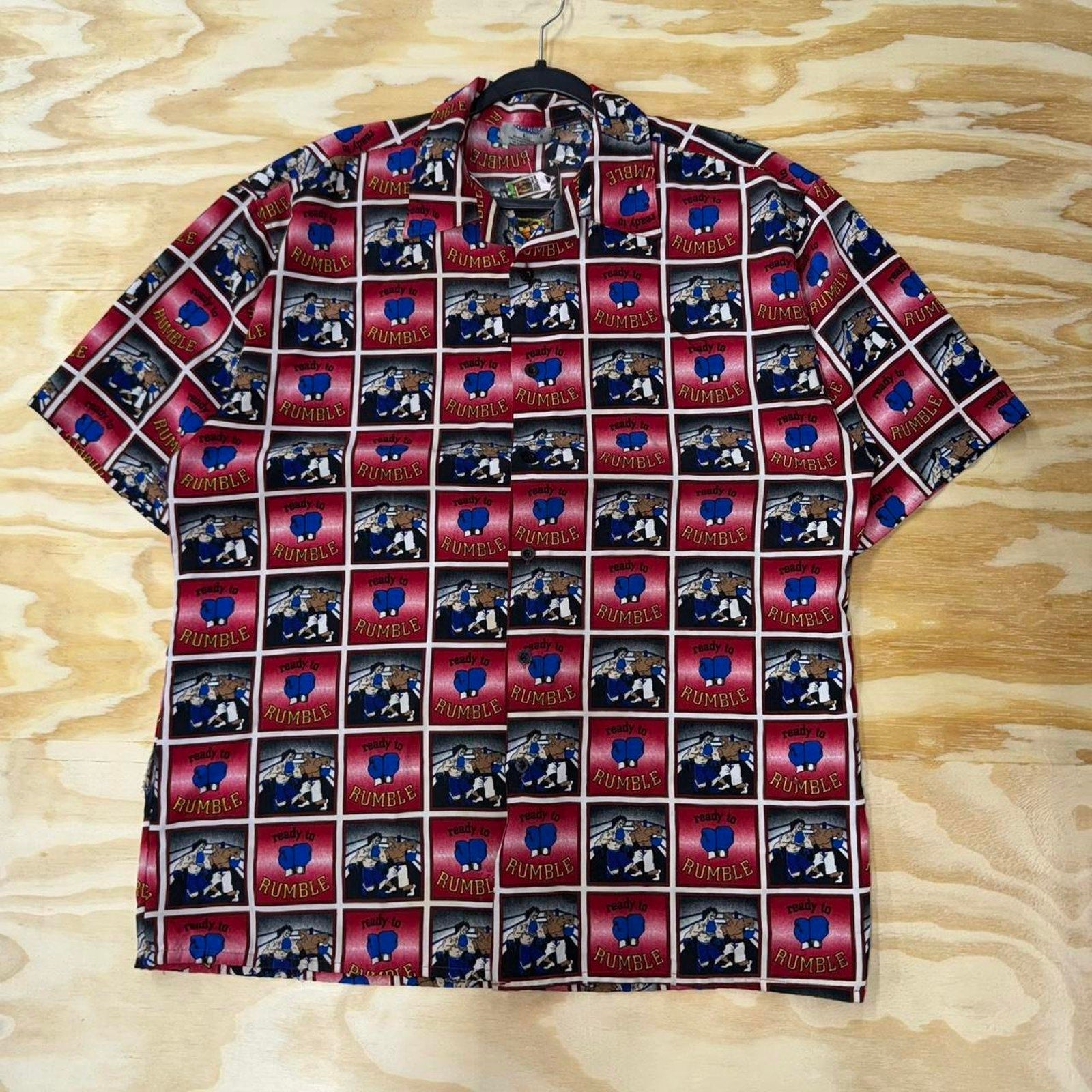 Vintage / Y2K Buda bean red Brooklyn breed ready to rumble AOP all over print repeat logo, graphic button up collared T-shirt rocky Balboa inspired