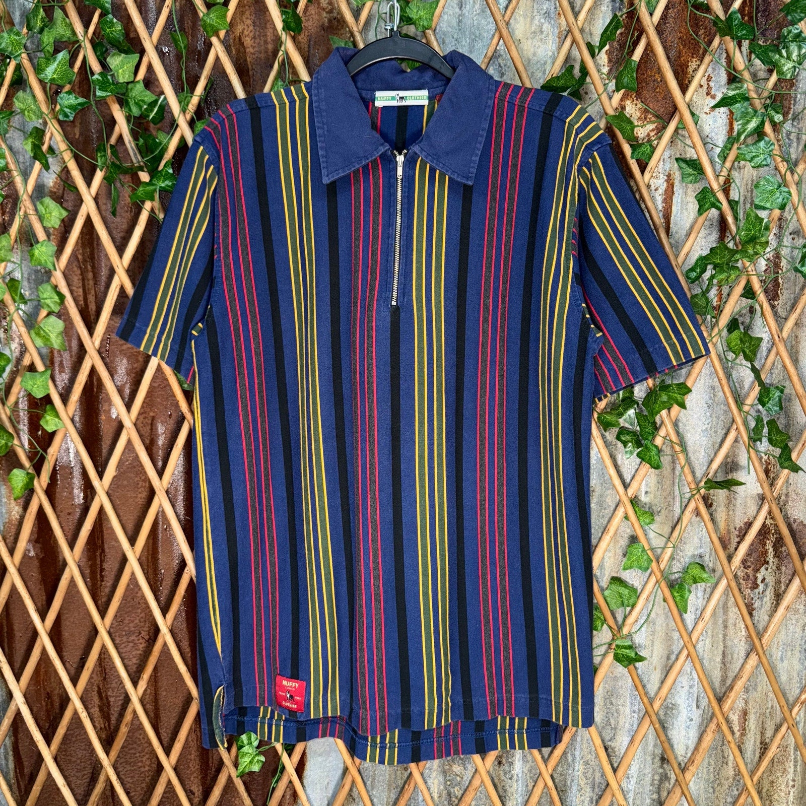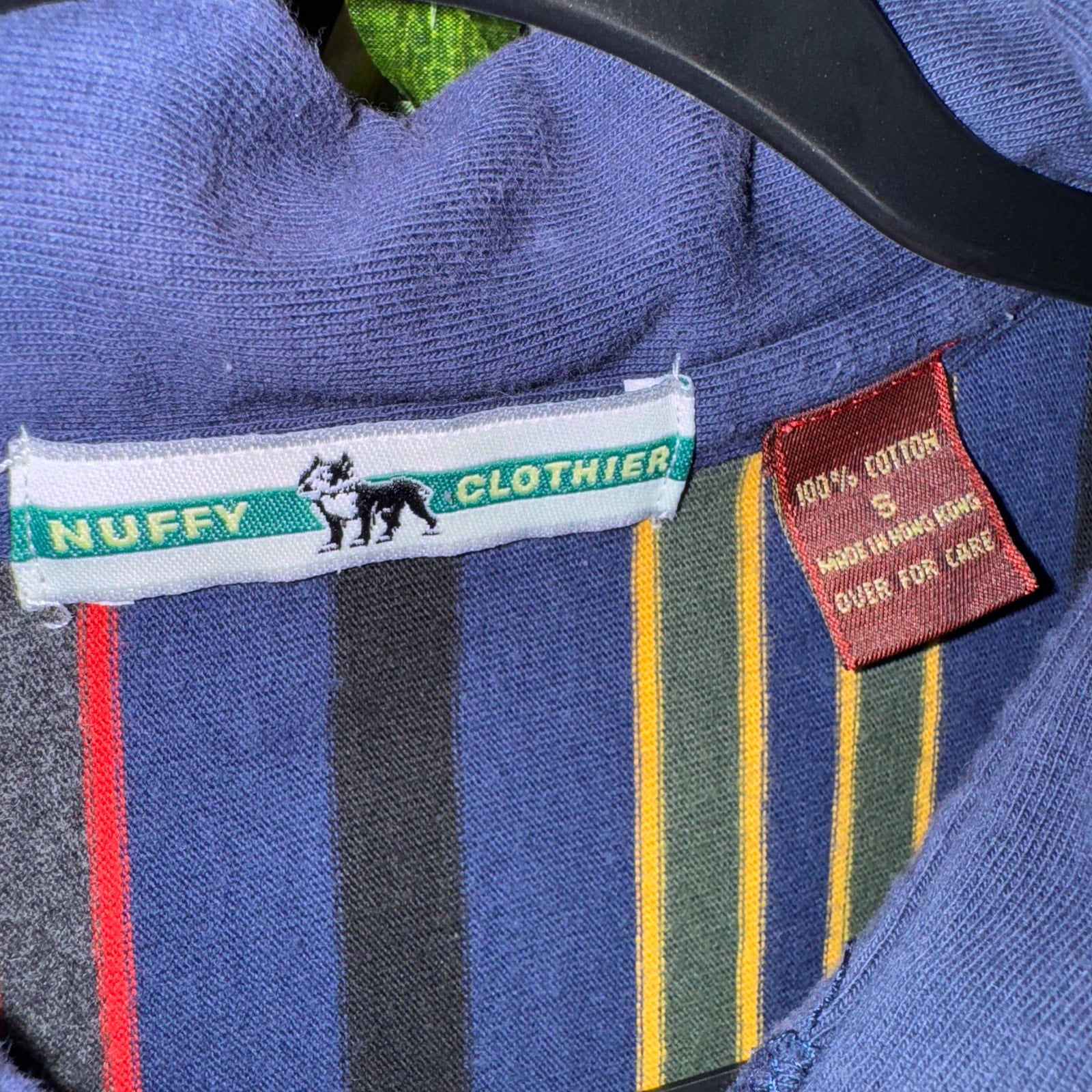 Vintage / Y2K Buffy clothier quarter zip vertical stripes navy blue polo shirt with green/yellow/red/black accents woven tag at the bottom 1990s era