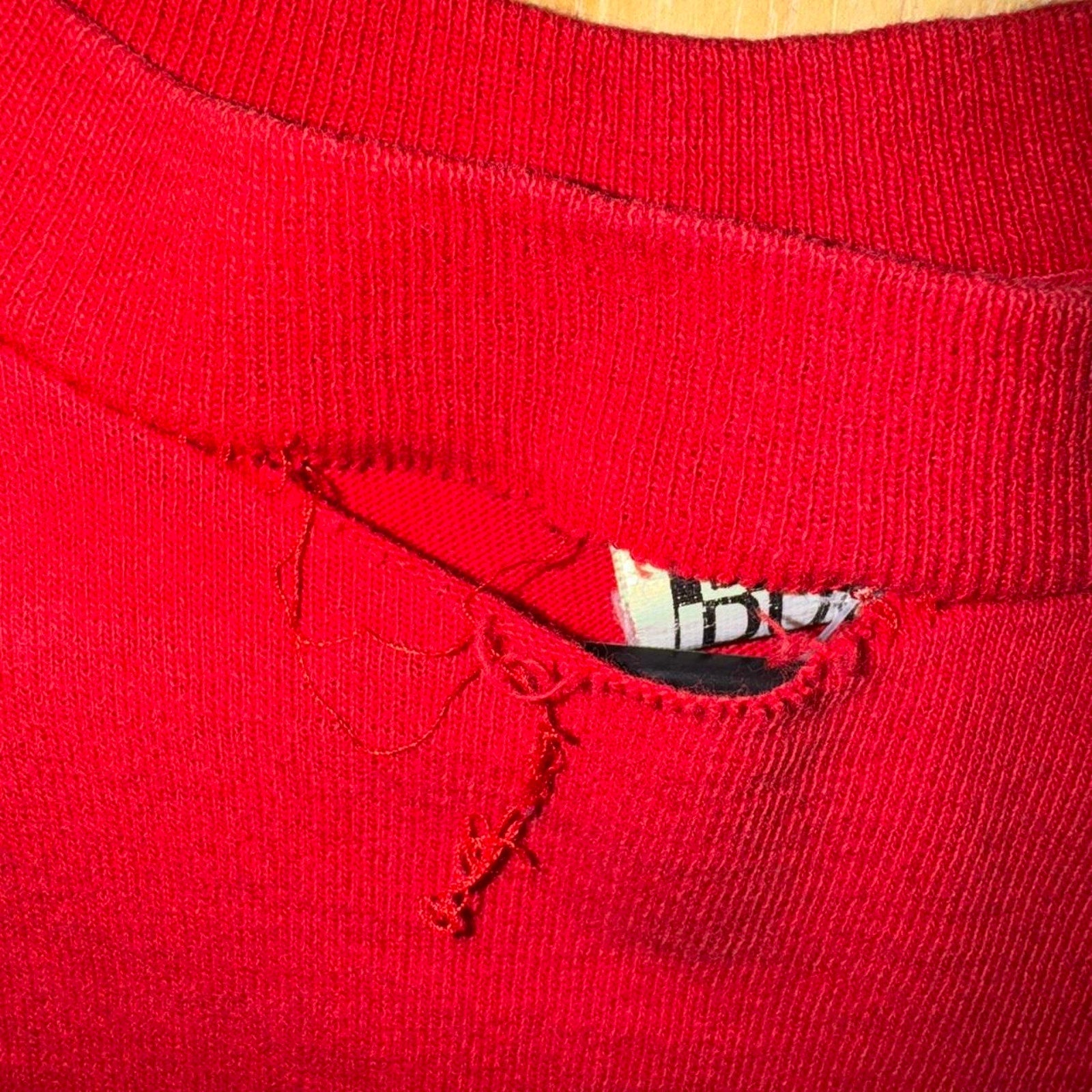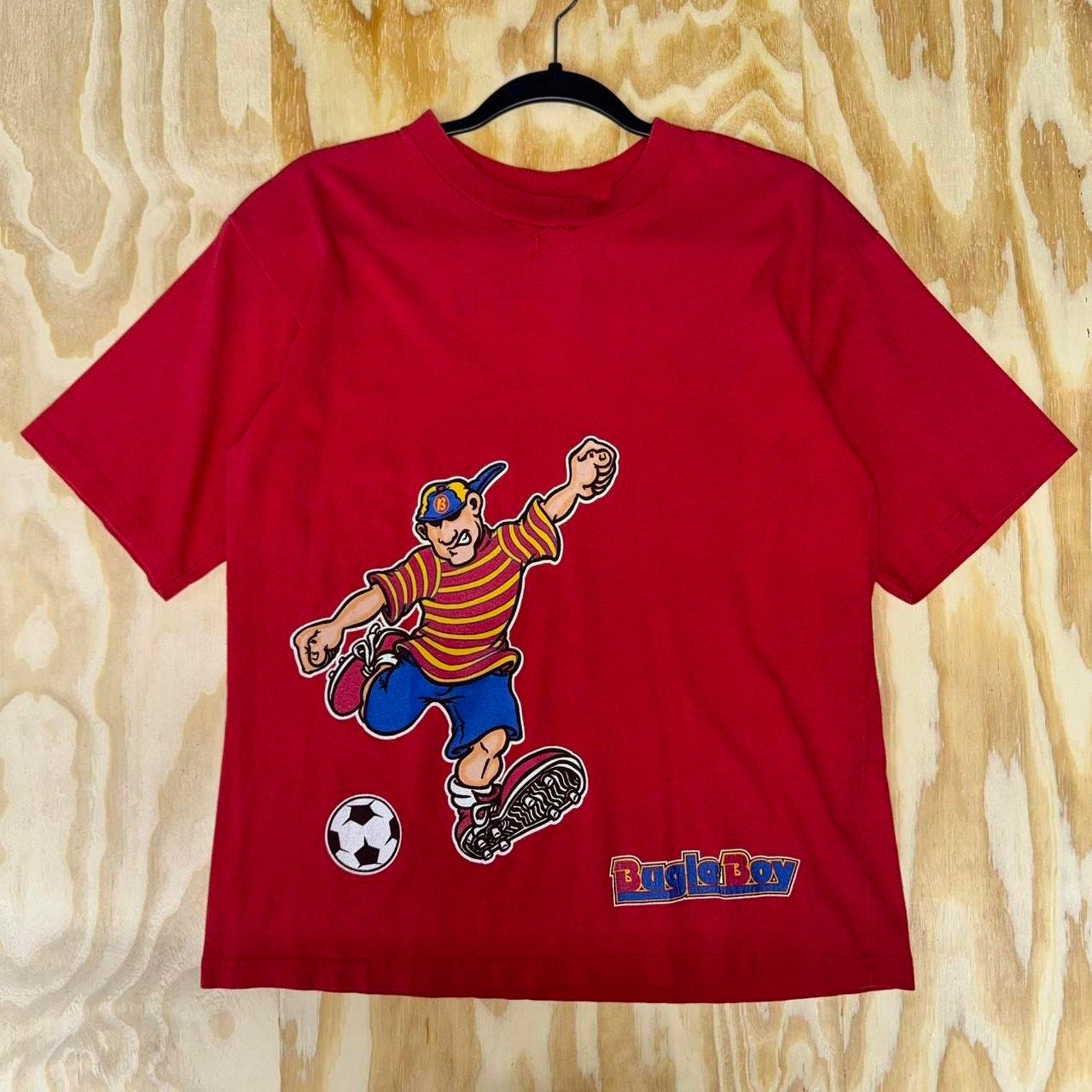 Vintage / Y2K bugle boy, hip-hop style character, kicking soccer ball / Futbol red Tee boxy fit 90’s / 00’s T-Shirt Made In USA rip in collar, easy fix